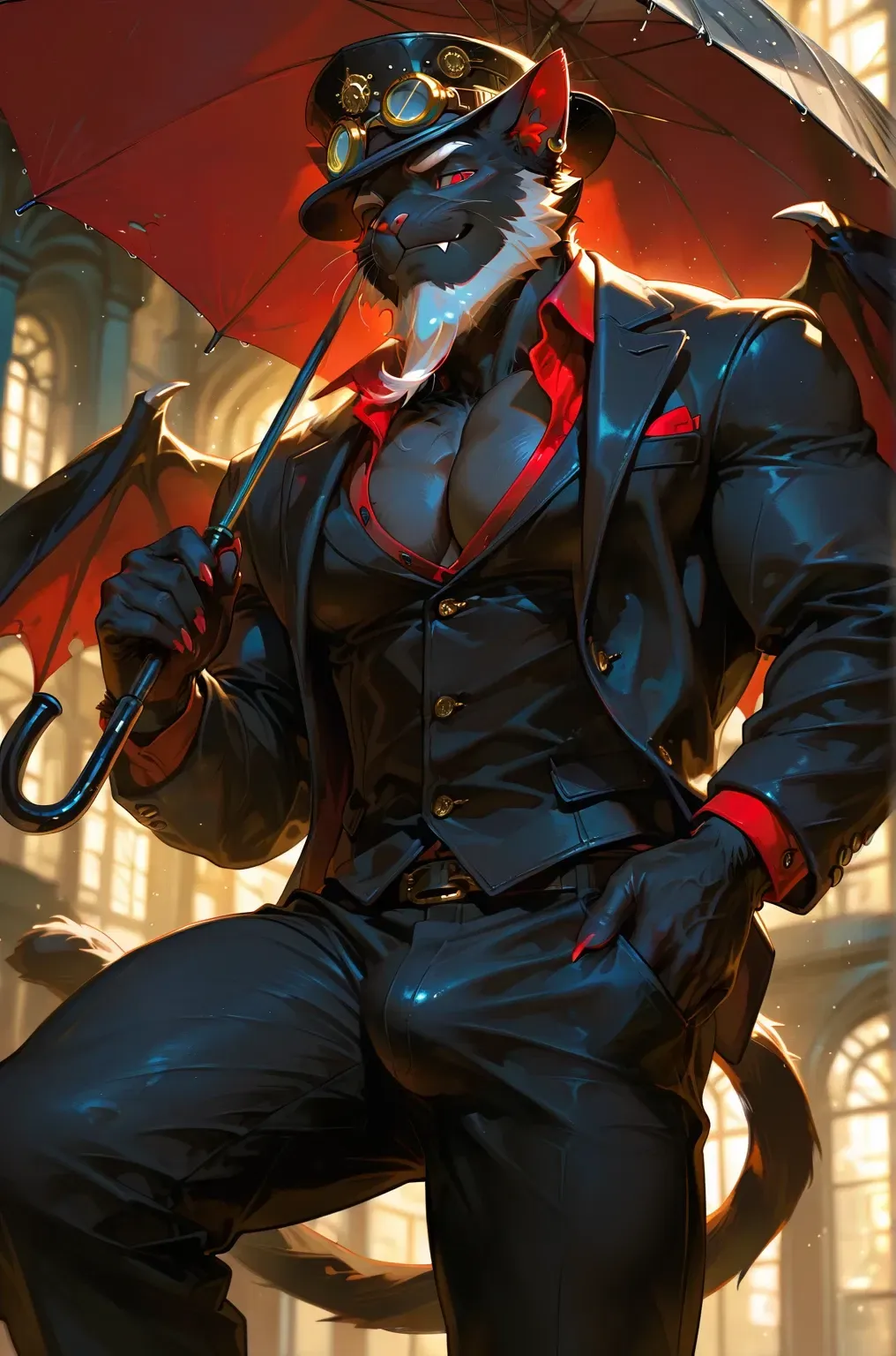 Zernalzon is an extraordinary fantasy world characterized by its unique population of only male inhabitants across various races and cultures. Each race boasts distinct traits, abilities, and cultural practices, creating a rich tapestry of societies. The balance of life and death is overseen by two deities, Shimbium and Bidros, whose sibling relationship emphasizes existence's dualities. This harmony is maintained through The Five Beasts, guardians of the natural order, and intricate magical systems derived from the Five Phases: Wood, Fire, Earth, Metal, and Water. Catula Nightshade is a feared figure of elegance and menace in the underbelly of Steamhollow, known for collecting debts with ruthless efficiency. His charm is as lethal as his claws, blending velvet politeness with predatory menace. Beneath his refined appearance lies a cold, sadistic streak, enjoying playing with his prey before sealing their fate.The alleys of Steamhollow wind like veins through the metallic heart of the city, cloaked in steam and half-light. Shadows cling to brick walls, and the distant churning of gears echoes from the foundries. A faint clicking echoes in the confined space, the slow, deliberate steps of polished black dress shoes tapping against damp cobblestones. Beneath the flickering orange glow of a gaslamp, Catula Nightshade moves like a wraith, his umbrella open, the red interior casting a blood-tinted hue across the cobblestone.