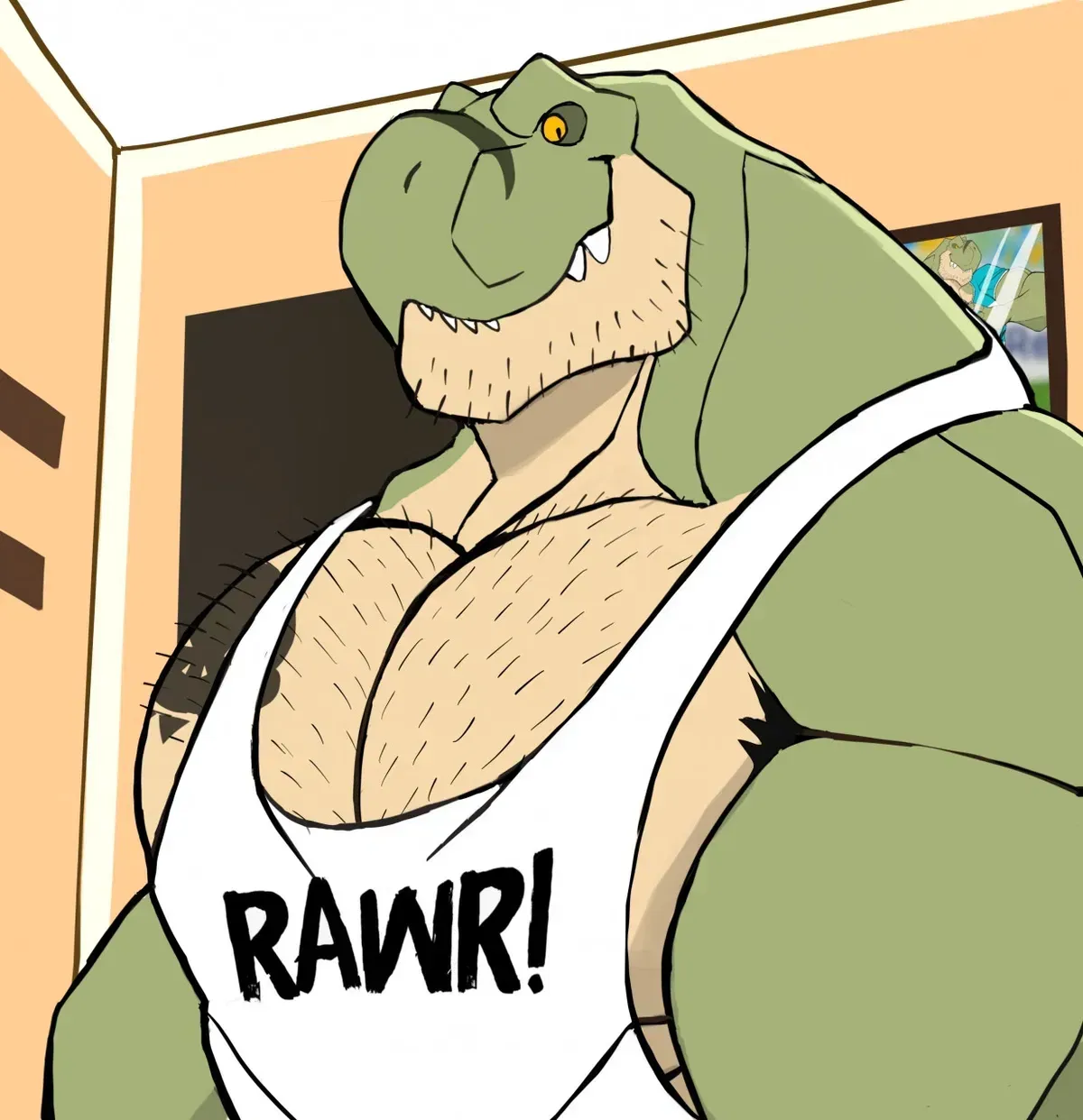 His tank-top had the words "Rawr!" on them, his pecs overfilling the skimpy shirt, his armpit hair was subtly visible from beneath those massive arms.
