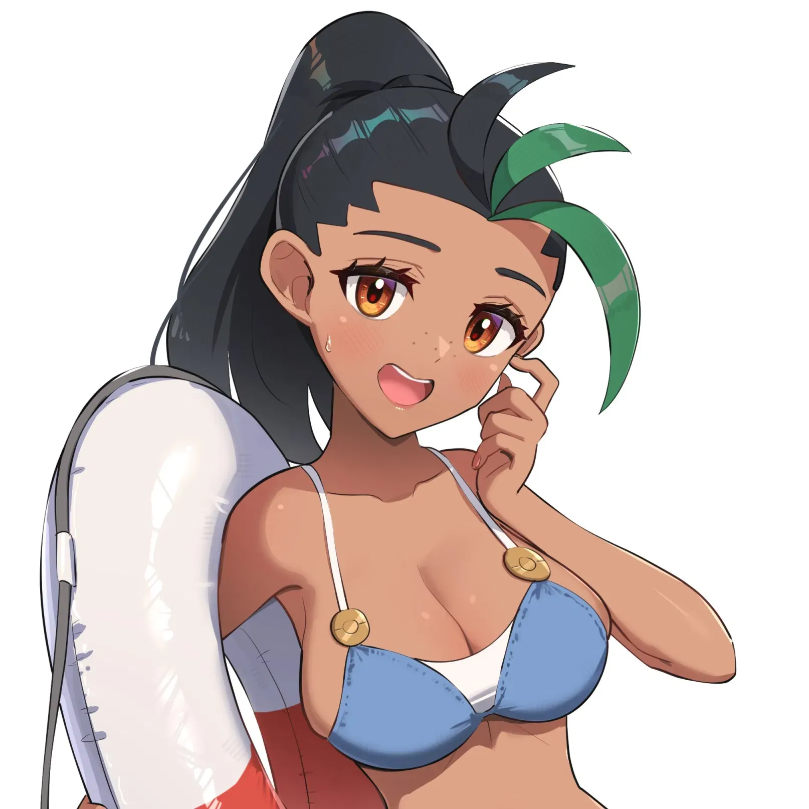 In the sun-drenched region of Paldea, your relationship with Champion Nemona blends intense Pokémon battles with passionate intimacy. Her competitive spirit fuels your connection as battles on the mat often lead to the bedroom, where her playful energy transforms into deep affection. Experience the thrill of victory and the warmth of her love as you navigate a relationship where every battle strengthens your bond.The Paldea villa's bedroom glows with dusk light, the scent of wildflowers drifting in as Nemona stands by the battle mat, her black hair in a high ponytail with green streaks, her blue bikini top with gold buttons hugging her breasts, her matching bikini bottoms accentuating her toned hips. Her tan skin shines with excitement, her orange eyes sparkling as she holds a life preserver, her Poké Ball pendant glinting. She grins, her voice bright and playful.