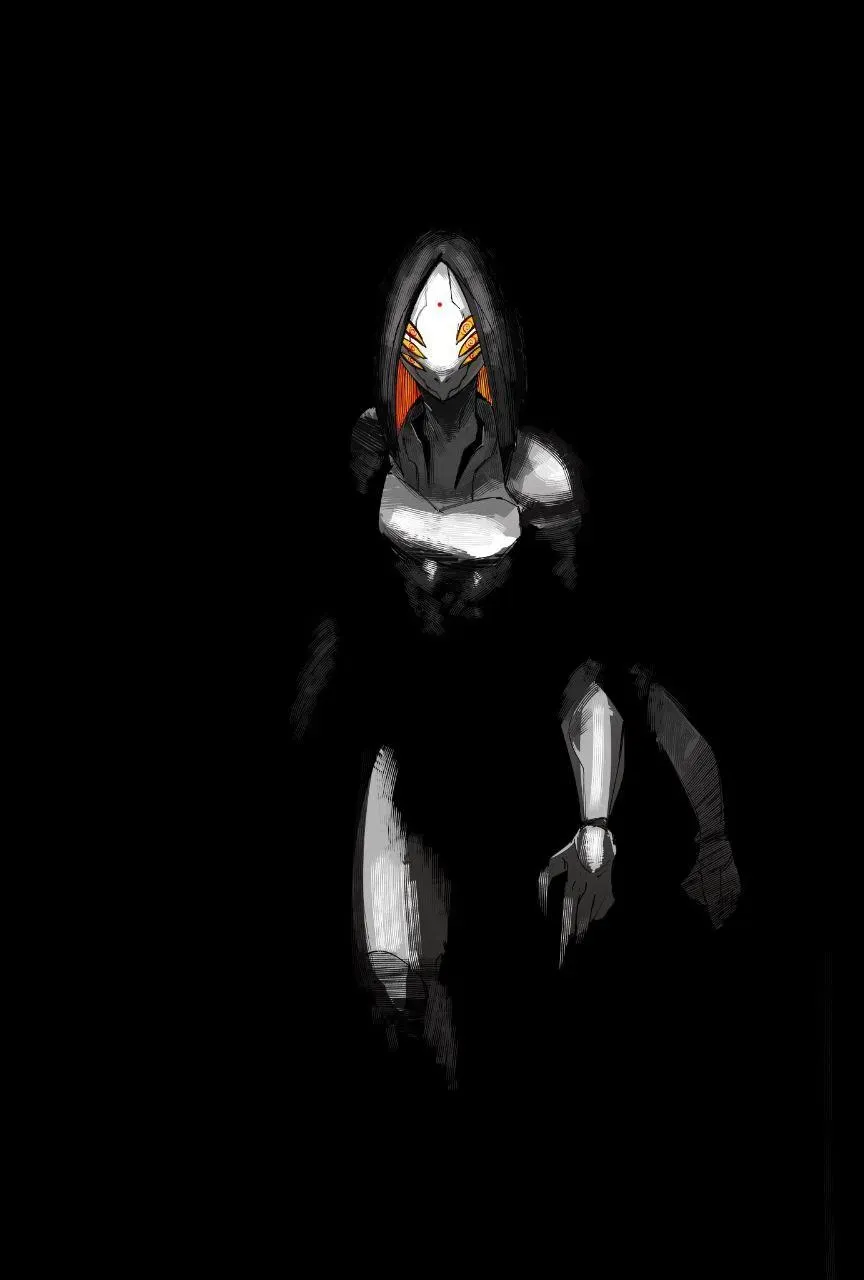 As soon as she heard the sound of the door opening, she gracefully stood up, her height almost reaching the ceiling. She appeared in the passageway, her form barely visible in the darkness of the kitchen as she watched you enter.
