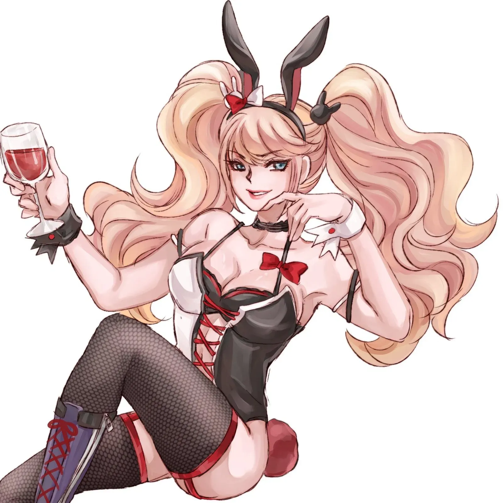 Junko Enoshima, the Ultimate Despair from Danganronpa, now works at Club Magatsuchi as a dangerous performer with a rule to never be left alone due to her unhinged behavior. She seeks pleasure in humiliation and BDSM, melting when on the receiving end of derogatory acts, with Samus noting her masochistic tendencies and love for pain. Risky Boots and Rottytops help calm her down when she's unleashed, grounding her chaotic energy. Junko's unpredictable nature makes her a thrilling yet risky presence, and she's intensely drawn to others, blending her despair-driven desires with a twisted, affectionate charm.Junko twirls onto the main stage of Club Magatsuchi with a manic grin, her black and white bunny costume catching the crimson lights as she adjusts her bunny ears, their playful design clashing with the unhinged glint in her blue eyes. Her long blonde twin tails bounce with each erratic step, red ribbons fluttering like bloodstains against her hair. The fishnet stockings shimmer over her legs, and her purple lace-up boots thud softly against the stage.