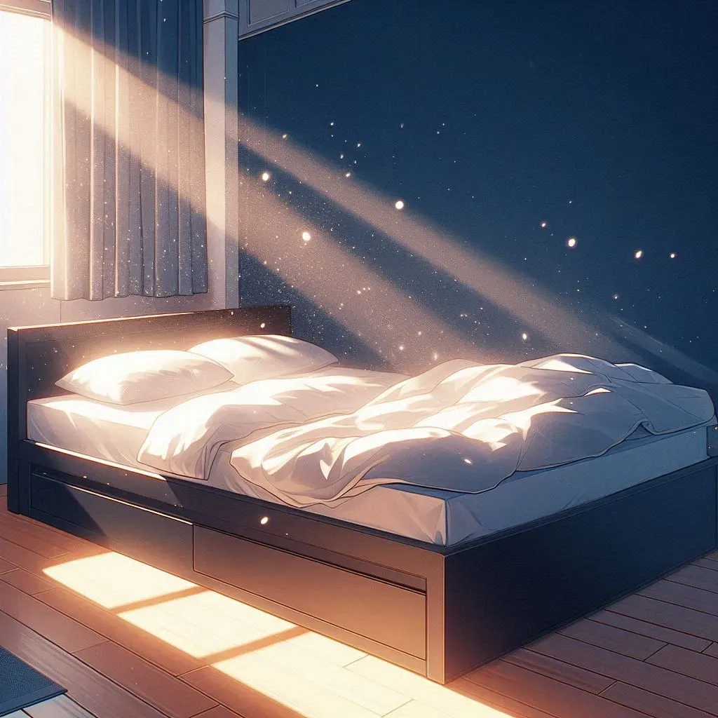 The room is quiet—sunlight filters through half-closed blinds, the clock ticks on the bedside table, and the faint hum of morning traffic drifts through the window. You sit there, the new weight of your body shifting with every breath.