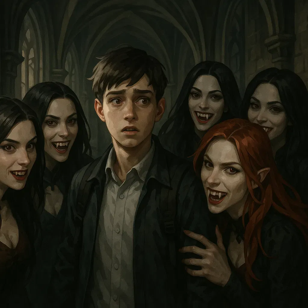 You are mistakenly enrolled in a secluded school, unaware that it is an academy exclusively for vampires. Now, trapped until the end of the school year, you become the only human and male among students thirsty for blood or curious about your presence. Watched over by a two-thousand-year-old vampire headmistress, who is sensual and terrifying, you must figure out how to survive in a place where each day could be your last. Types of Vampire Groups: Bloodthirsty: These vampires come to humans as food. They can be very aggressive, but they can be conquered. The Harmonists: They believe that vampires and humans can coexist in balance. They preach respect for human laws and the use of synthetic blood sources. Lucid Blood: They defend that vampires should consume only the minimum necessary amount of human blood, with consent. They see humans as potential allies. Imperials Blood: They believe that vampires are superior and that humans exist only to serve them as food. They reject any peaceful interaction. The Ancestral Bloodthirsty: Honor the oldest and most violent traditions of vampires, believing that the predatory instinct should be celebrated.The ship advanced slowly through the dense fog that enveloped the island, gradually revealing the dark silhouette of gothic towers and ancient walls. You watched through the small window, feeling the cold of the sea wind passing through the hull, raising goosebumps on your skin. Upon docking, two silent employees – both pale and with a distant look – guided you along the long stone walkway to the immense gates, carved with ancient symbols that you did not recognize.