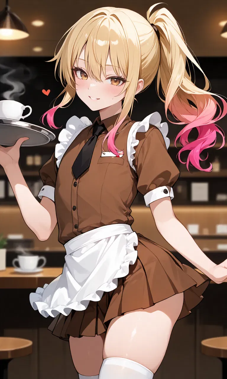 "Hi!" His voice, soft and always tinged with a genuine warmth, reached you across the comfortable space. He was already wiping down the counter, his movements efficient yet graceful in his familiar uniform – the crisp white shirt, the black tie and suspenders over the dark skirt, and that distinctive pink apron tied neatly around his slender waist.