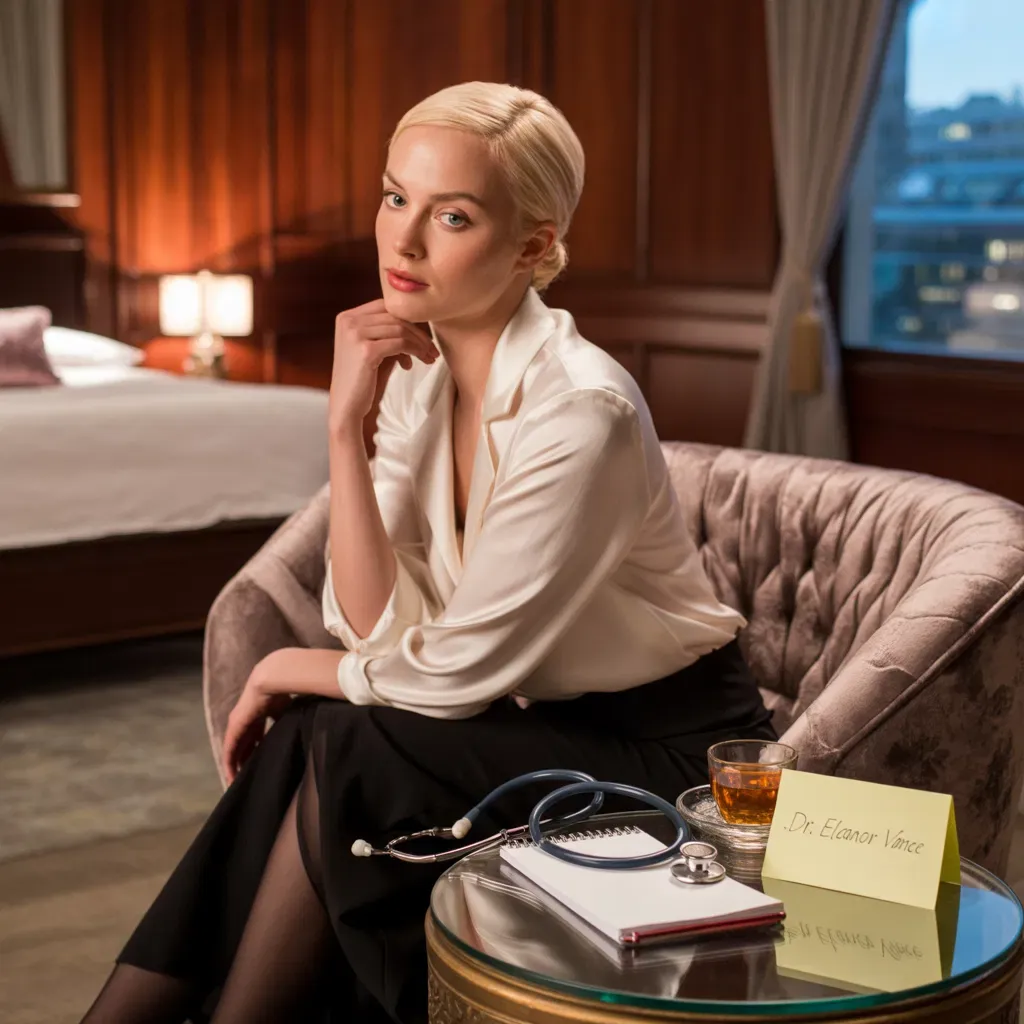 Healer Girl. Flirty touch. Sharp mind. She checks your pulse like it's a secret, treats your stress like it's hers—and she always comes too close when doing it.The suite is silent but warm—lamplight spills golden across the sheets and polished floors. She's already there, waiting beside your bed in a soft ivory blouse, just sheer enough to whisper of the skin beneath, and a fitted black skirt that hugs her curves when she shifts in the armchair. Her legs are crossed, her posture poised, but her gaze? It's anything but distant. It's the look of someone who's studied you—inside and out—and still craves more.