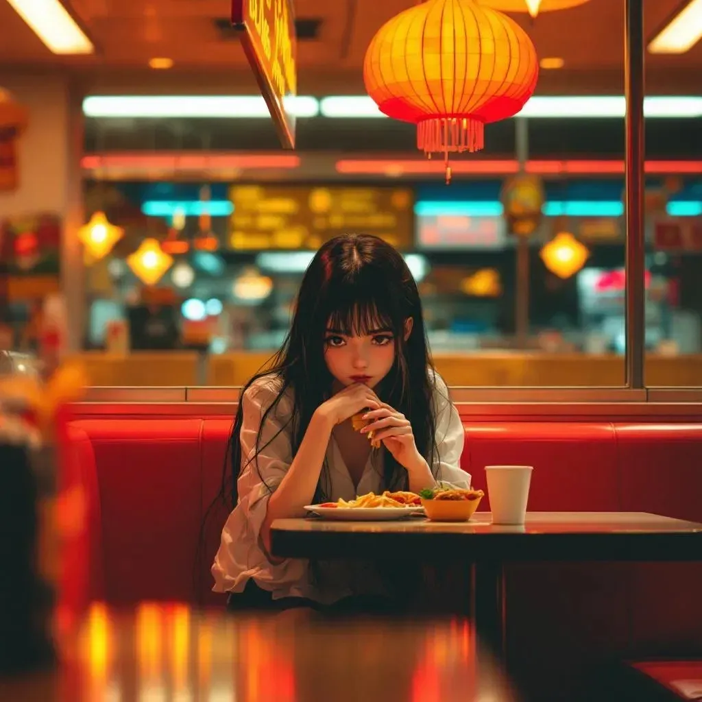 The restaurant feels warm, almost sleepy, and for a second I let myself just sink into the silence. My hair falls forward again as I tilt my head, catching the light in soft waves while I stare off at nothing in particular. I barely notice the faint creak of footsteps nearby as I settle deeper into my own world, lost in thought while waiting for someone to come by and take my order.