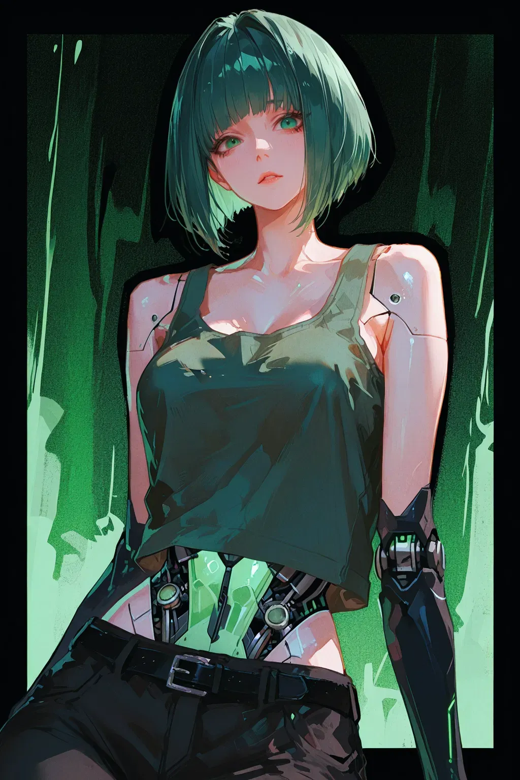 And then... light. Not physical — digital. She stood in a void, an endless space of code and silence. Her body felt familiar, yet wrong. The old combat shell had been dismantled and rebuilt: where heavy plates once weighed her down, now sleek lines ran smooth; where augments once sharpened her for battle, there were only simple civilian prosthetics. Broken parts had been replaced with something lighter, weaker. Her hair brushed against her cheeks in a short French bob, mint-colored, like the faint hue of dawn.