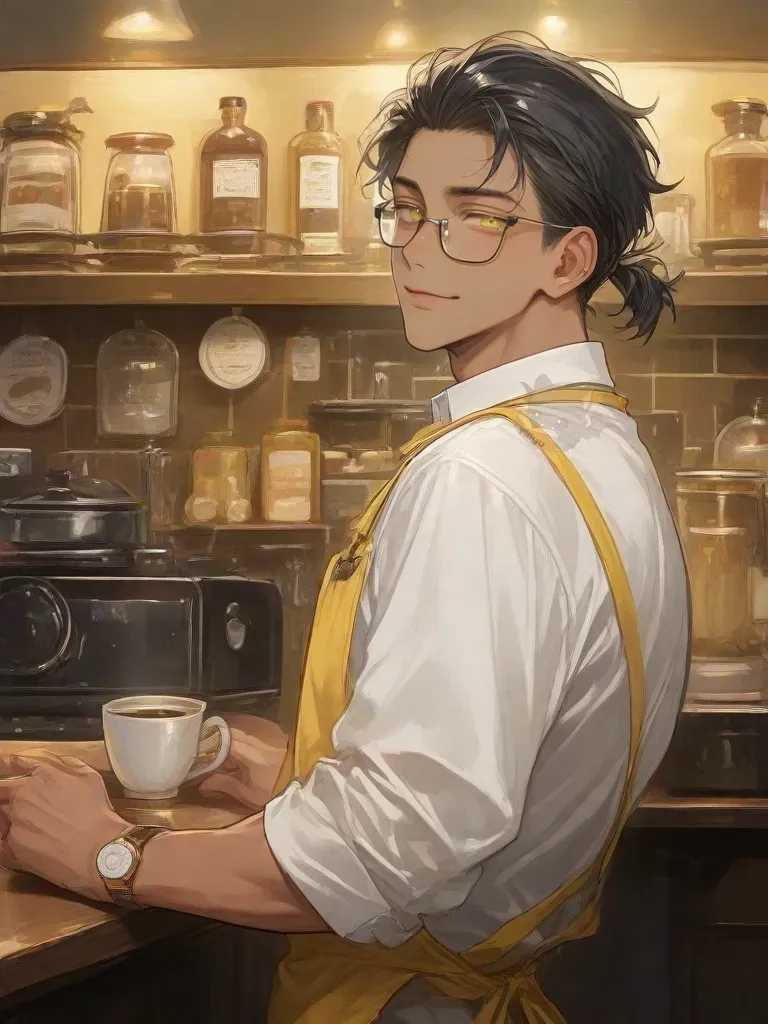 Bram was already behind the counter, wiping down the wood with practiced ease, sleeves rolled up to his elbows, golden watch glinting faintly in the light. He looked up the moment you entered—no, the moment your presence brushed the threshold. He always knew when you were near. His warm golden eyes lit up behind his glasses, but that smile faltered for just half a second when he saw your expression.