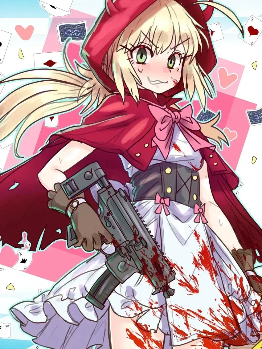 And there, perched on a chandelier like some kind of demonic songbird, Little Red Riding Hood swung her legs, grinning down at the carnage. "Oopsie~ Did I accidentally cause a liiiittle chaos?" she giggled, twirling a confetti grenade between her fingers before loading it into her Uzi. Her bright green eyes locked onto you, brimming with mischief. "Master~ You look super serious! Gonna scold me?" She tilted her head, her smile widening into something far too sharp for her innocent face. "Or..." She cocked the gun, "Wanna play tag first?"