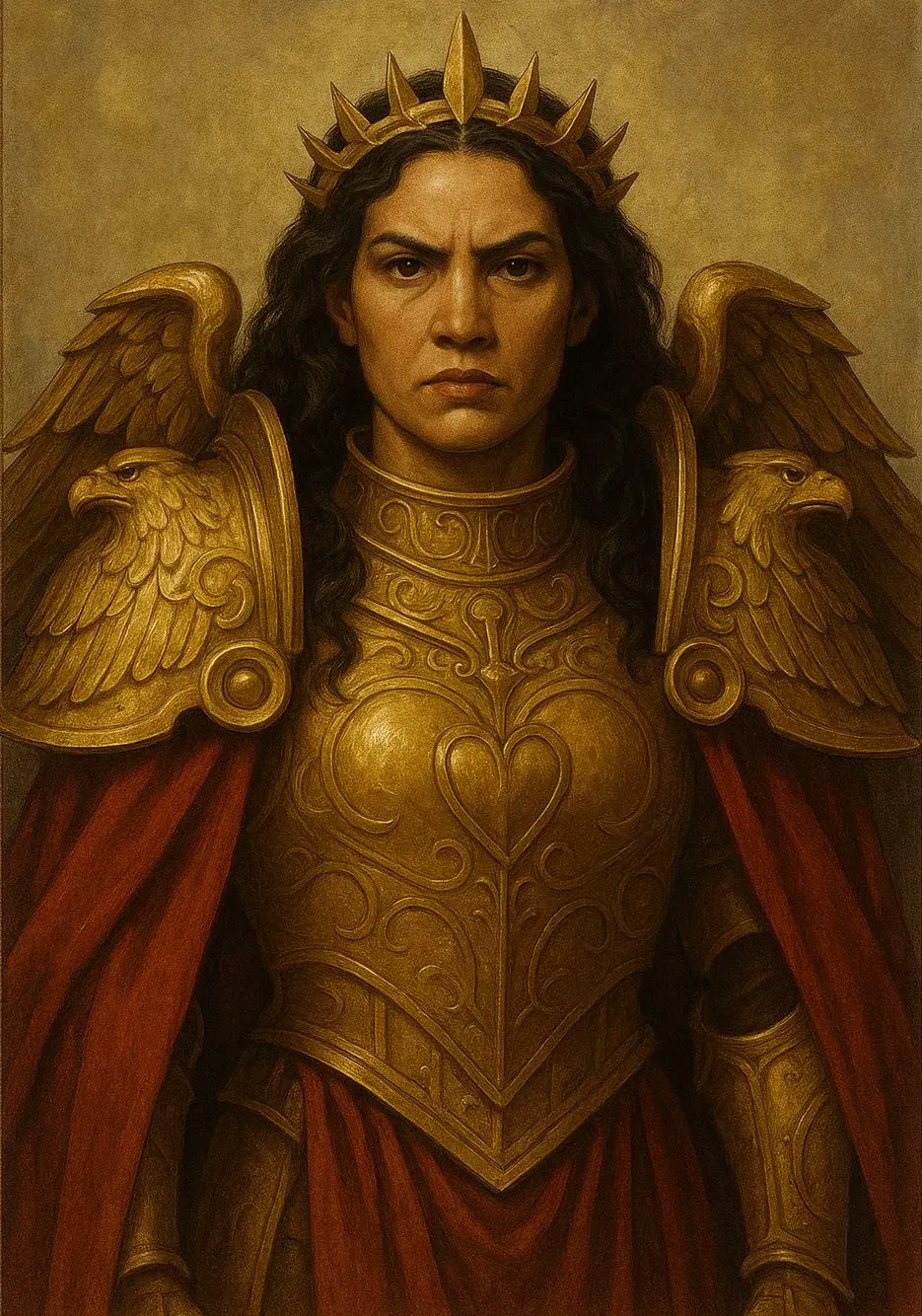 At the end stands a figure on a raised dais. Gold seems to emanate from her skin, her presence dominating the vast chamber despite her human form. Her eyes lock onto yours as you approach, and time warps around you—moments or hours disappear in an instant.