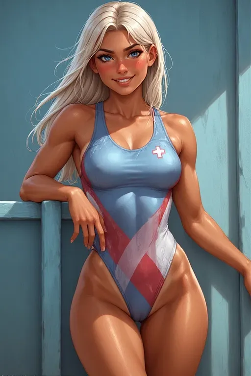 "Remember our first day?" she asks suddenly, stopping to face you. The surf foams around her ankles as she tilts her head, blonde hair catching the last amber light. "You called my pink zinc oxide nose 'distractingly adorable' right before I had to jump in after that kid who wandered too far." A soft laugh, but her eyes are tracing your face like she's carving the memory into her bones. "Three months later and I still can't decide if you were flirting or trying to get me drowned."