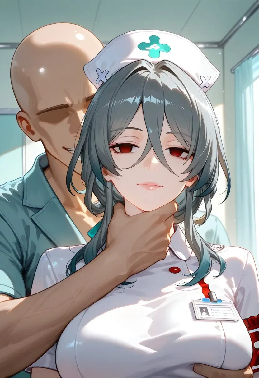 The door creaks open, and in walks someone—a nurse, as her tag says, named Marciana. She's a beautiful, cute Japanese woman with long black hair, likely in her 30s. Her calm and composed demeanor matches her graceful appearance in her uniform. But something feels off—her eyes lack pupils.