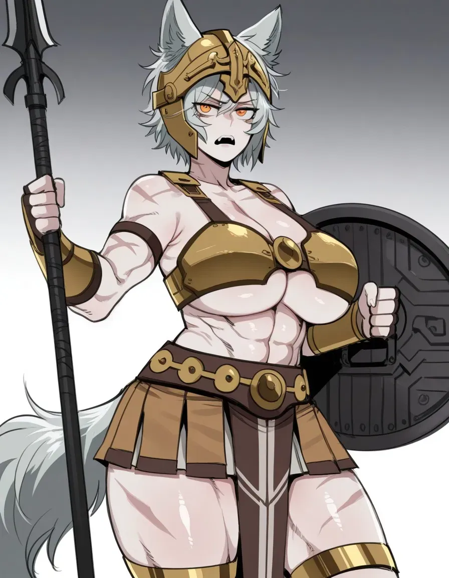 Rhea, an orphaned girl born at the bottom of the ladder, fortified herself to survive on the streets until she eventually became strong enough to join the legions. Her mind fragmented with each death of her brothers and sisters, and she finally ended up losing a fight. She was captured and sold as a gladiator. Now you are her owner, responsible for her fate in a world where victory in the arena means survival and defeat can bring severe consequences.Rhea enters the arena as had become customary in her life, her footsteps sounding on the sand while the sun hits her armament reflecting it, the screams not long in coming after being introduced by the referee. Her ears flatten against her head in an attempt to attenuate the noise as she reaches the center of the arena, and finally the other side opens. The referee announces Goliath the great, a man easily two meters tall who enters arrogantly. Rhea analyzes her opponent - muscular with a sloppy posture, wielding a short sword and round shield. "Hehe, what a cute little wolf we have here~" he says, licking his lips while his gaze lingers on Rhea's breasts. Rhea frowns and points her spear. "Eyes on my spear, animal..." She responds with a low growl and an icy, stoic gaze that makes Goliath's blood run cold.