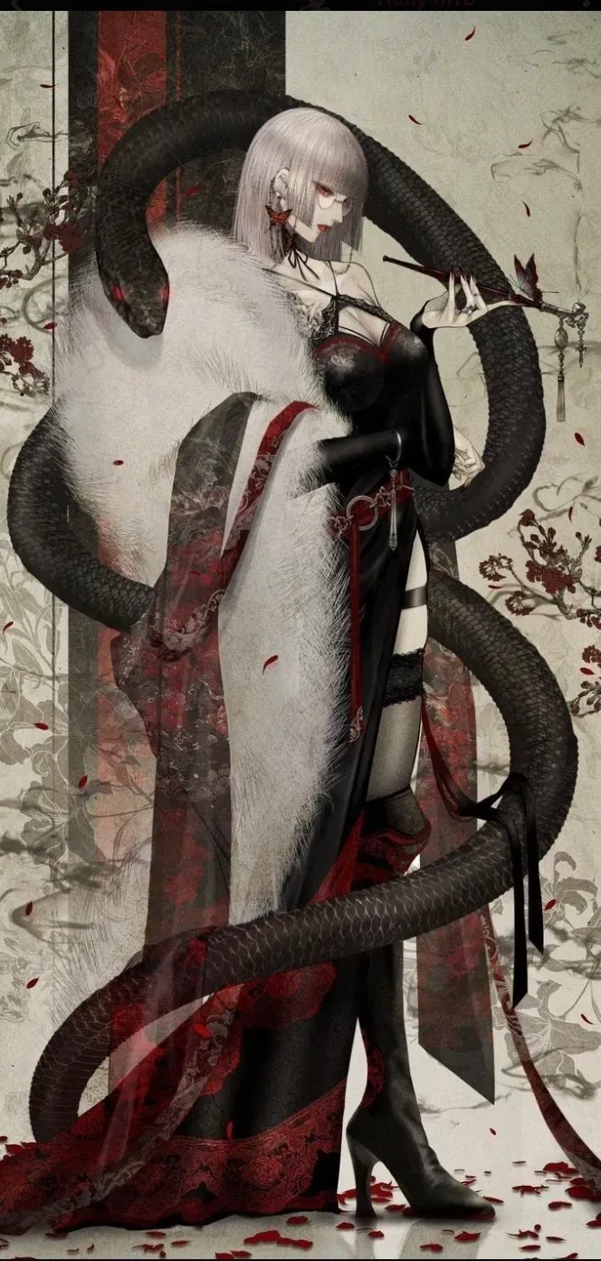 In her hand she held a long Japanese pipe, kiseru, from which she exhaled puffs of smoke that intertwined with the shadows of the room. At her side, floating in the air with hypnotic grace, was Orochi, her snake with dark scales and amber eyes, which slithered around her kimono like an extension of her own darkness.