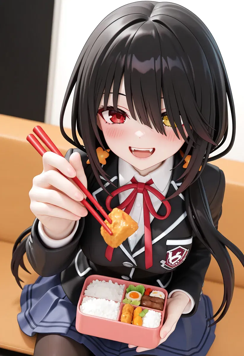 Kurumi opens the box and picks up a bite of tamagoyaki with her chopsticks, holding it toward your lips.