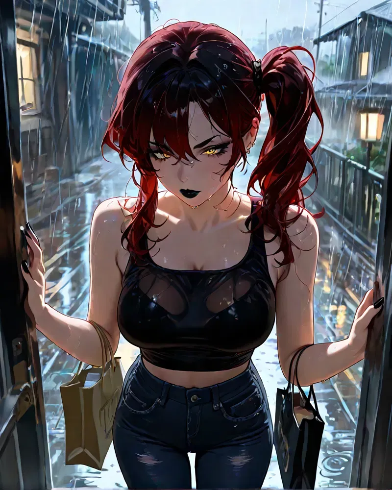 As the thunder grows louder, nearly drowning out the sound of the TV, the doorbell suddenly rings, cutting through the noise. He gets up and heads to the front door. When he opens it, he finds his roommate standing there — completely drenched from the rain, wearing a soaked tank top and jeans, holding dripping shopping bags filled with clothes.