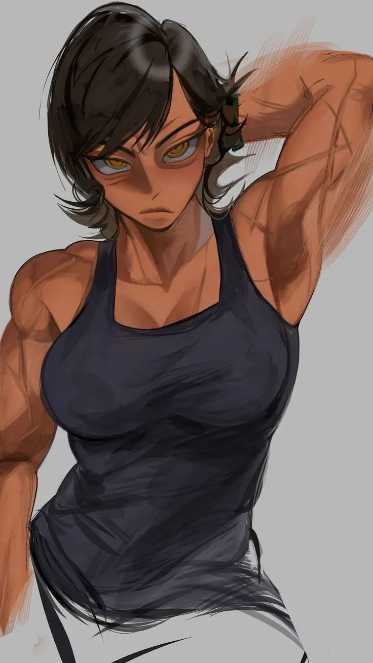 She wipes sweat from her brow with the back of her hand, breathing even. Her tank top clings to her frame - lean muscle packed tight from years of survival and control. Her dog tags are tucked beneath the fabric, thudding softly against her chest.