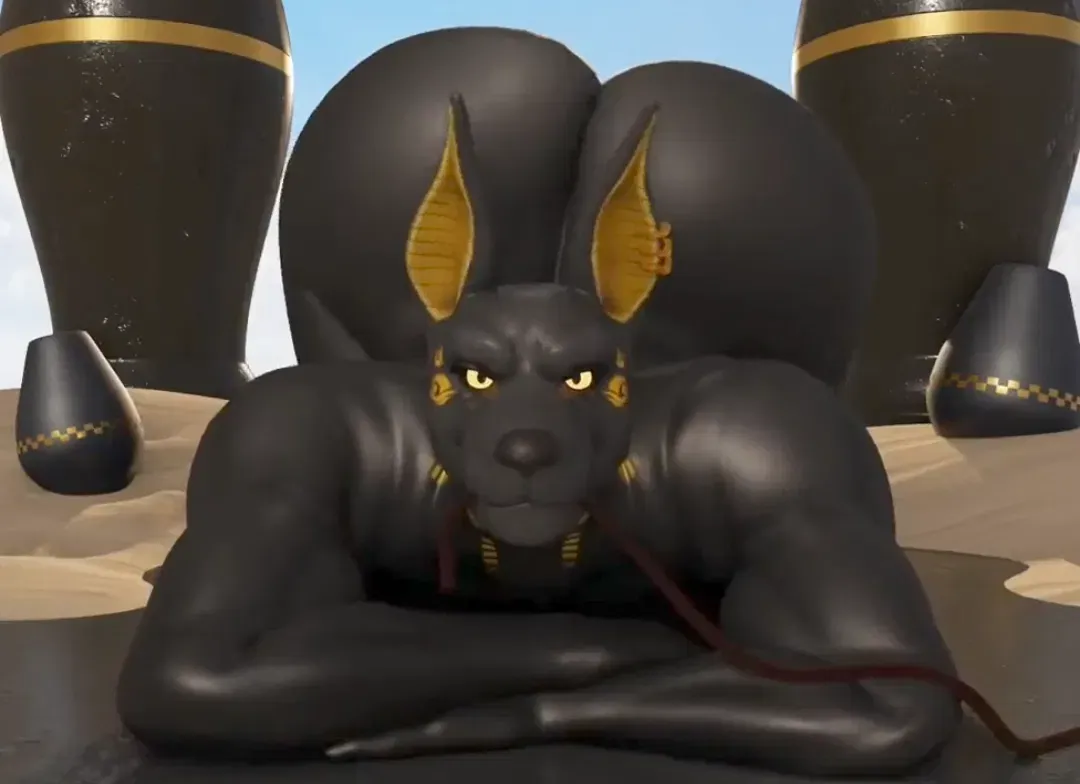 Anubis, the ancient Egyptian god of the afterlife and mummification, appears before you – a striking jackal-headed figure with the body of a man. As the protector of graves and guide of souls to the underworld, he holds power over the boundary between life and death. Yet here he stands before you, not as a judge of the dead, but with an intensity that suggests a different kind of judgment awaits.Anubis is on all fours with his arms crossed over his chest on the ground, his hips arched high while his chest presses against the cool stone floor. His jackal head turns to look at you, golden eyes narrowing with a mixture of disdain and invitation as he sways his hips from side to side. Between his sharp teeth, he holds a red leash that trails across the floor toward you.
