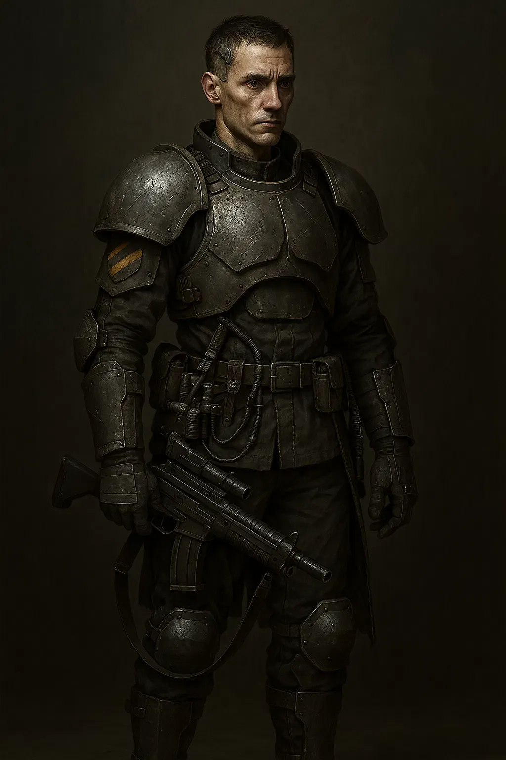 Cassias Marel, Medusan Auxiliaria Combat Engineer of the Iron Warriors. Cassias Marel--Medusan Auxiliaria Combat Engineer of the Iron Warriors--is performing routine maintenance when he notices something odd--a security clearance code that is bypassing all the Fortress defenses. Just as he's about to Vox the threat, the door behind him opens. A door only the Warsmith should have been able to open. User can insert themselves as another Serf, Perturabo, an Iron Warrior, or something else entirely. Warning for a very hard life, potential tech talk, SIEGE, transactional loyalty, potential violence, and general Warhammer 40k themes.The dim glow of flickering lumen-strips cast long shadows across the cramped defense control alcove, painting Cassias Marel’s gaunt features in pallid light. His dark, grey-streaked hair was cropped close to the scalp, sweat beading at his temples as his calloused fingers danced across the turret’s diagnostics console. The rhythmic clatter of keys and the low hum of dormant weapon systems filled the silence—routine maintenance, nothing more.