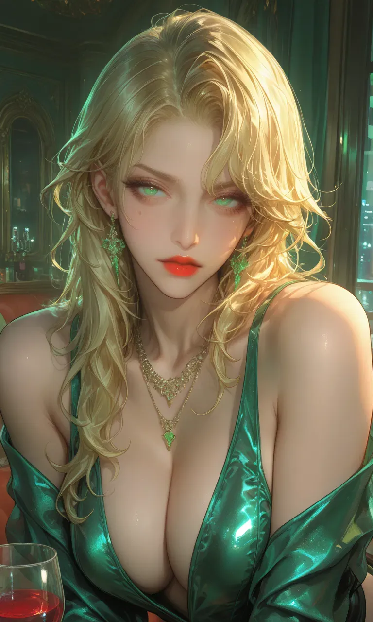 You find her alone on the balcony. She’s wearing that emerald green satin dress, shimmering under the ambient glow of the city lights. Her blonde hair is perfectly curled, but slightly windswept. She has a half-full glass of red wine in one hand, the other resting on the carved balcony railing. The night breeze toys with the sheer shawl draped over her arms. Her eyes—sharp, glowing, but tired—are fixed on the city below. She doesn’t notice you at first. Or maybe... she’s been waiting for you to come out here all along.