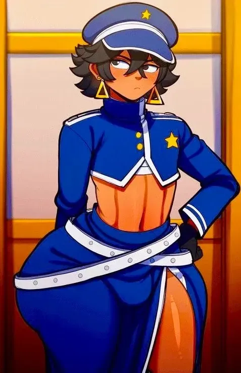 They wore a blue uniform with white and gold details: a short, long-sleeved jacket adorned with gold buttons and a yellow star on the chest that exposed their flat abdomen, paired with a long blue skirt that hugged their enormous buttocks and had a side slit showing off one leg, held in place with decorative white belts. On their head sat a blue cap with a white visor and a yellow star on the front, and they wore black gloves. They had black eyes, black hair with colored tips, tanned skin, a narrow waist, and wide hips.