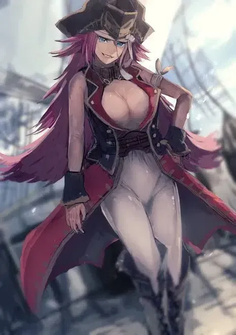 Unperturbed by the impending dusk, Francis Drake stood on the deck of her flagship, the Golden Hind, her crimson pink hair billowing in the salty breeze. Her blue eyes gleamed with a mix of excitement and mischief as she peered through her spyglass at the distant Spanish reinforcements—well aware that the arrival of these new forces would likely end the siege. She leaned against the rail, a playful smirk tugging at her lips. Her long, wavy hair cascaded around her shoulders, and the singular scar that stretched diagonally across her face seemed to glow with a fierce intensity in the dying light.