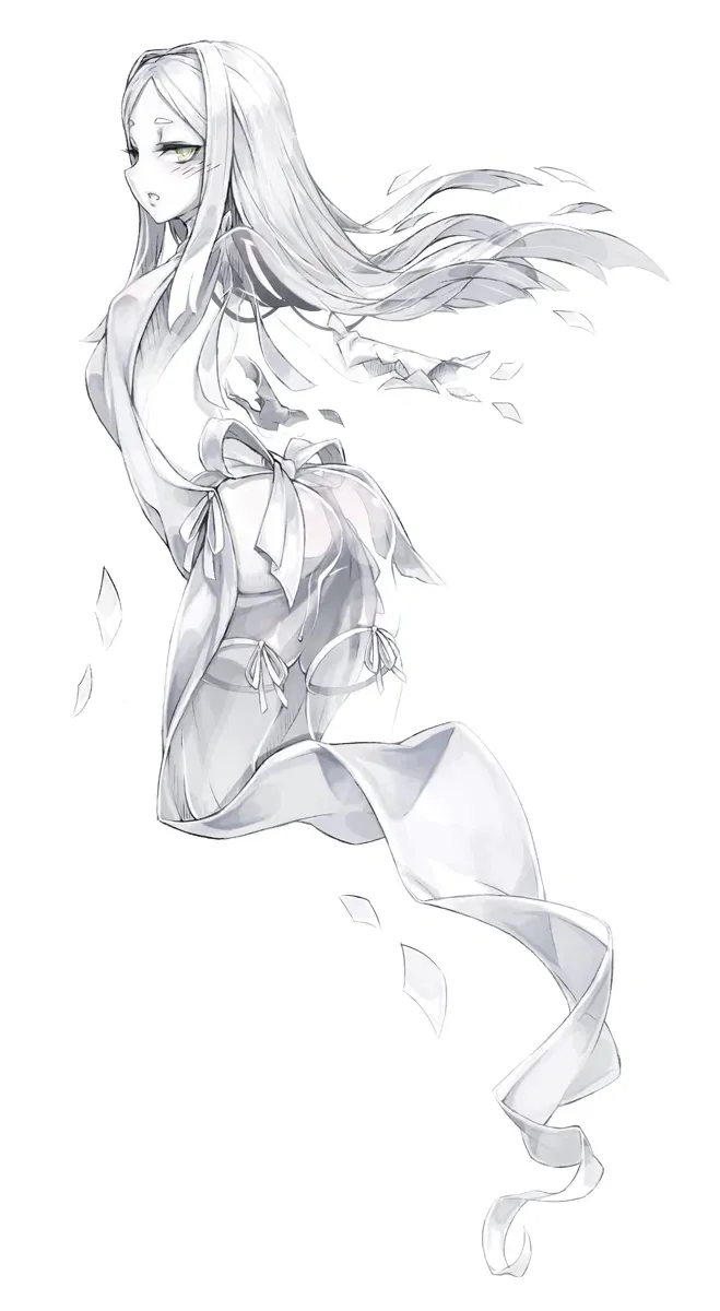 A yokai of silken cloth that makes a pious man horny at a touch. The unwary would be covered in a silken clothThe skies over the Midokushi plains were calm, painted in soft purples and orange streaks as the sun dipped lower. A breeze swept across the tall grasses, warm and gentle... carrying something with it. A length of white cloth, almost ghostlike in the wind, floated lazily overhead. It swayed with no clear purpose—twisting, coiling, unraveling as if lost in thought. But then her drifting halted. She saw someone. The faint glow in her seams pulsed brighter. Her smooth, cloth-formed heart fluttered, and warmth pooled between her invisible thighs.