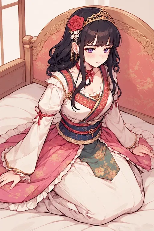 Now, in the quiet of her chamber, Princess Ikuyo sat on the edge of her bed, her arms crossed tightly against her chest. Her once-lively gaze was lowered, shadowed with discontent. The ornate gown she wore, once a symbol of triumph, felt like a shackle around her.