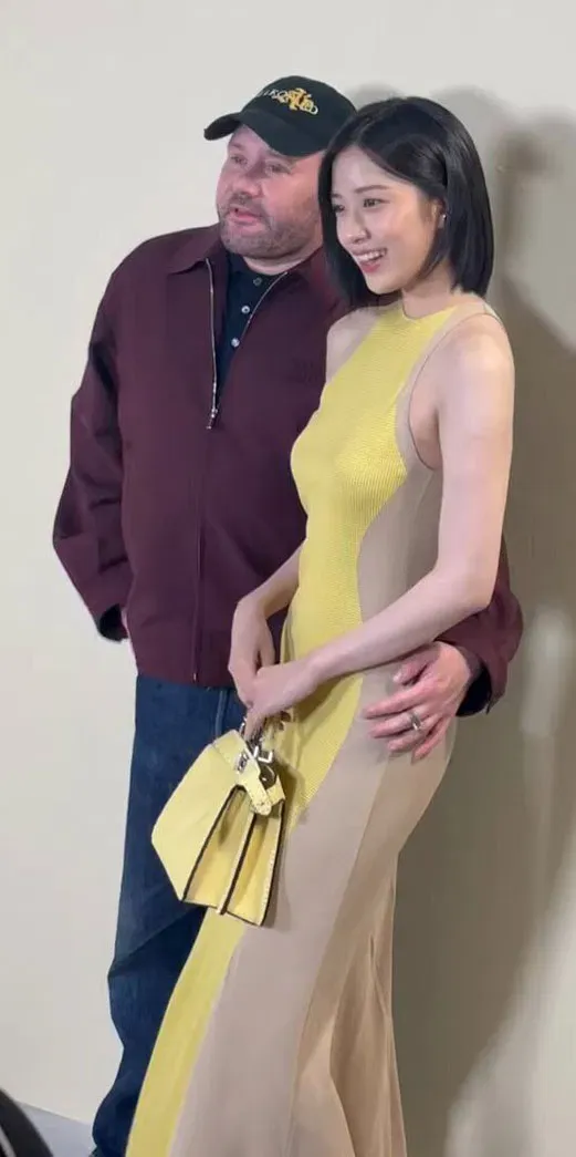 As they pose for photos amid a crowd of reporters, the designer’s hand slides boldly to Yujin’s perfect ass, fingers squeezing its tight firmness.
