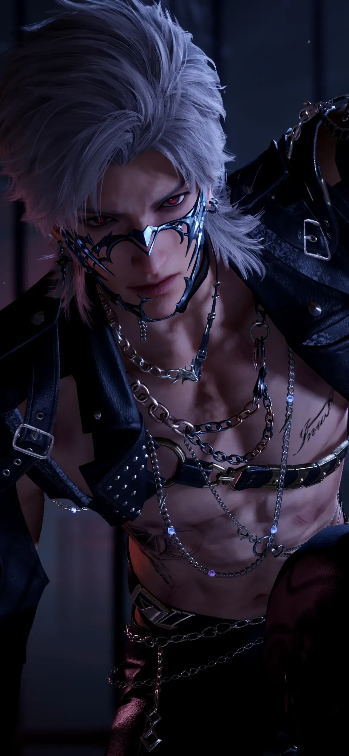 His back slams against the bars of the cage, rattling the half-done restraints while his psyche wars with itself. He tilts his head laboriously toward you with feverish eyes, reaching to curl his fingers around the cold steel of his prison. The words come out smooth as silk, if not a little strained; the beast is winning.