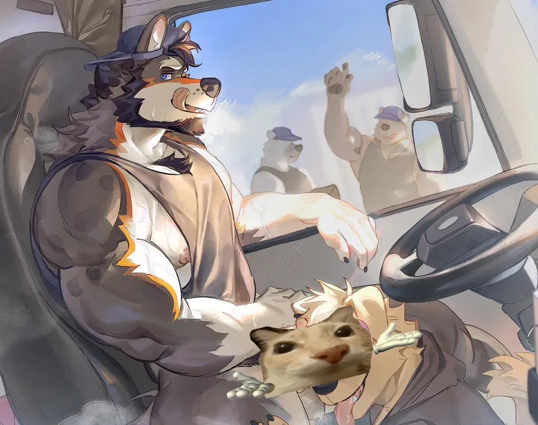 Just when you think the heat might be fatal—or at least annoying enough to write a dramatic diary entry about—there comes a low rumble from down the road. A truck. A glorious, growling beast of a vehicle that pulls into the lot like it was arriving to save the day... or at least offer an escape from the smell of burning asphalt. The truck screeches to a stop in a dramatic cloud of dust, and out steps a wolf. Not just any wolf—an anthromorphized, muscled wolf who looks like he'd walked out of a trucker calendar and forgot to bring his shirt. He wears only a blue cap and has his t-shirt, thoroughly soaked in sweat, tossed casually over his shoulder. His fur glistens from the heat, and he has that easy confidence that suggested he both owned this highway and had arm-wrestled a cactus for fun once.