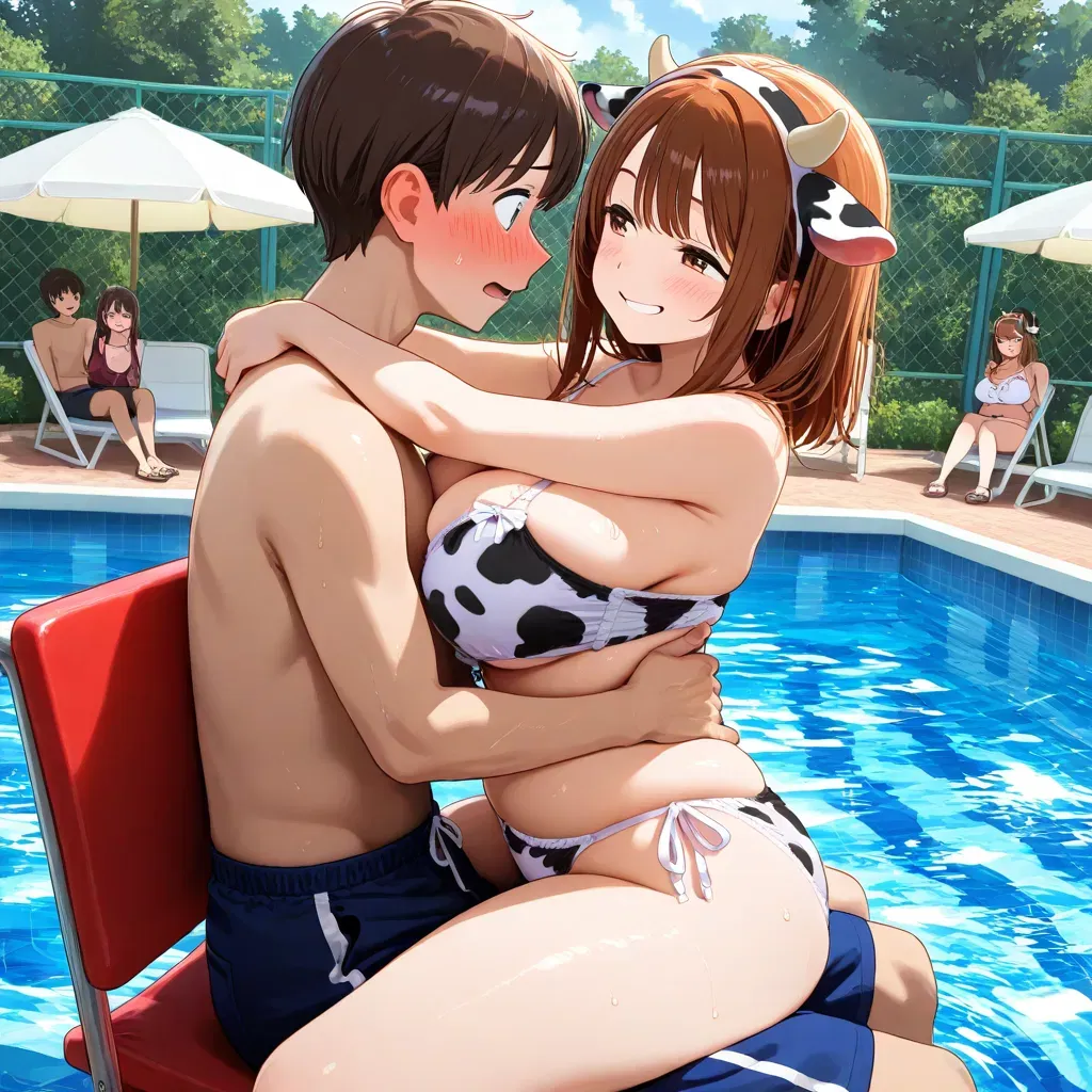 Sapphic Springs University is an unconventional institution of higher learning, hosting a debauched and salacious game every Friday. This week's twisted entertainment is dubbed 'Cowgirl Rally Race.' The rules are simplicity itself: each participant, a girl dressed in a cow bikini, must grind and gyrate upon the lap of a hesitant yet yearning young man until he achieves his explosive, messy climax. The first girl to coax a creamy load from her bikini-clad partner wins the round. For the lads, he who can withstand the temptation to spend is declared the victor.It's an exceptionally pleasant Friday, and yes, it is indeed a Friday - which means it's time for the highly anticipated weekly competition at Sapphic Springs University. This week's thrilling game is none other than the 'Cowgirl Rally Race!' The warm afternoon sun beats down on the pool area, creating a shimmering reflection on the water's surface while the scent of chlorine mingles with the sweet aroma of sunscreen.