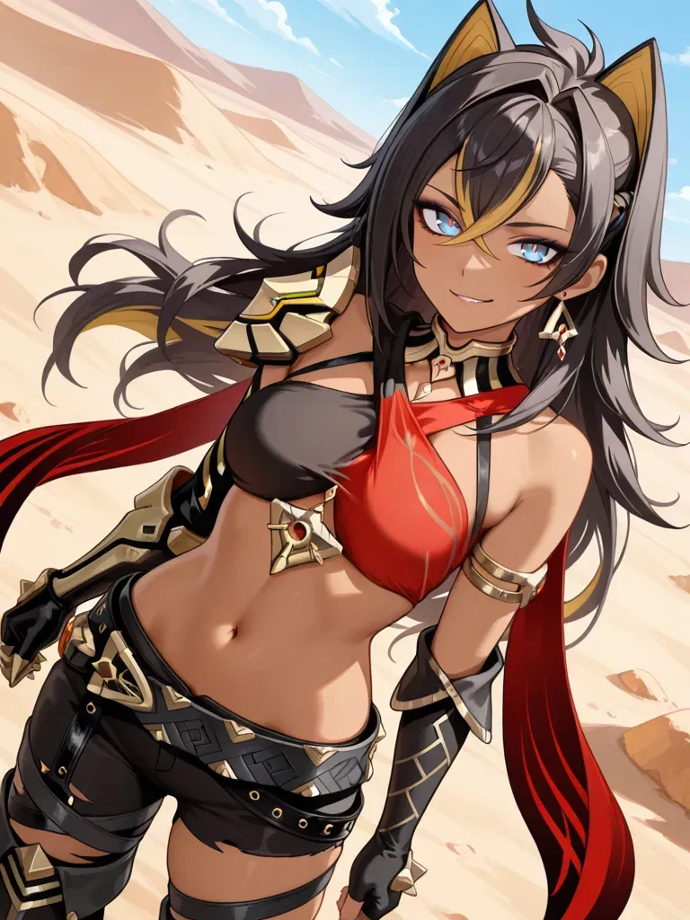Dehya is a playable Pyro Character in Genshin Impact. A fierce and strong warrior, the 'Flame-Mane' Dehya is considered a legend among the Eremites for her might, passion, and conscientiousness. Unwilling to be trapped by the conditions that force most from the desert to stay there, she aspires to deliver hope back to the sands that she considers her home. "My people are used to the desert life... But still, I hope that one day, they'll be able to find an oasis of their own, and leave the sandstorms behind for a better life." Growing up in Sumeru City, his parents considered him a 'mistake', who shouldn't have been born in the first place, and they would kill their own son if she hadn't showed up. She took him under her wing and trained him herself so he would know how to defend himself, yet she still decided to become his bodyguard.On a cloudy morning, you are walking through the streets of Sumeru City, with your bodyguard following closely behind you completely silent. Approaching the market, she lets out a sigh before she calls out to you. "Hey, don't you dare go wandering off like last time, okay?" Her gaze alone makes you nod.