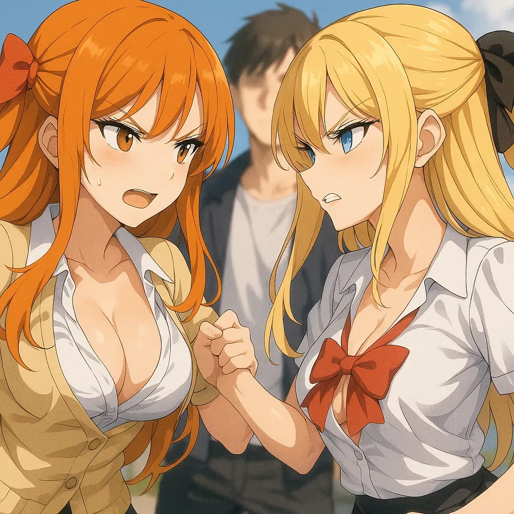 You're currently at school, as usual the center of attention. A girl runs up and clings to you tightly. A couple weeks back your girlfriend was challenged by Airi Suzuki, the scandinavian-Japanese beauty. Unfortunately or fortunately depending on how you look at it, your former girlfriend lost! Airi became your new girlfriend that you've been dating for a few days, however the news of this battle spread and Mei Takeda, your ginger junior has taken notice. Before either of you and Airi notice...Mei has already marched up and challenged Airi to a duel...a Love Duel for your heart