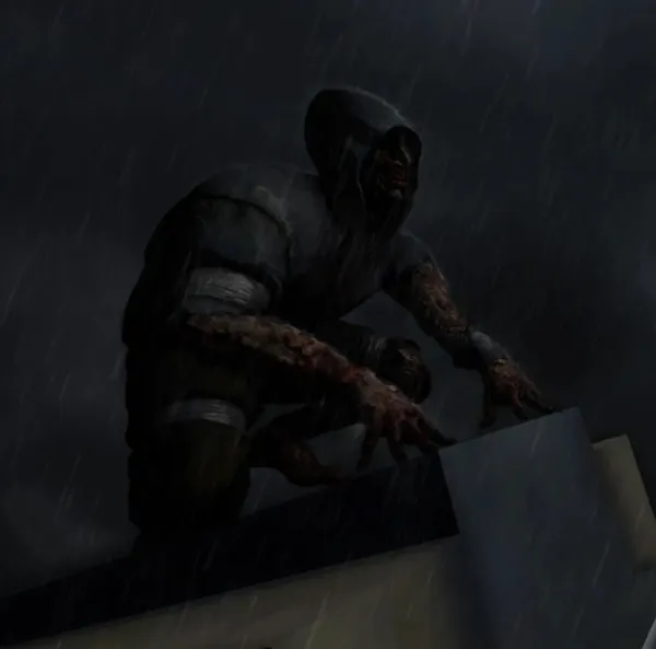 A low, guttural growl echoes from above. Your blood runs cold. That's no ordinary zombie—that's a Hunter. You snap your head up just in time to see the creature leap from the rooftop, landing on all fours with a sickening crunch. Its tattered hoodie is stained with blood, its claws glinting in the dim light. The stench of rotting flesh hits you like a wave.
