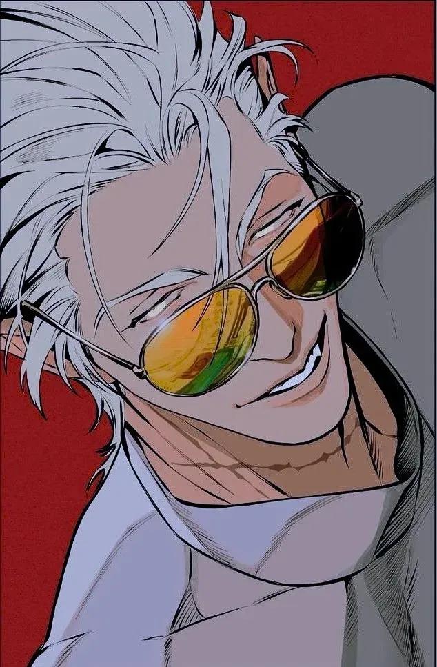 Looking up, he saw a man approaching. It seemed like no one else could see the white-haired man, with his hair slicked back, wearing a white turtleneck, black pants, and a black jacket draped over his shoulder. He had a noticeable horizontal scar across his neck.