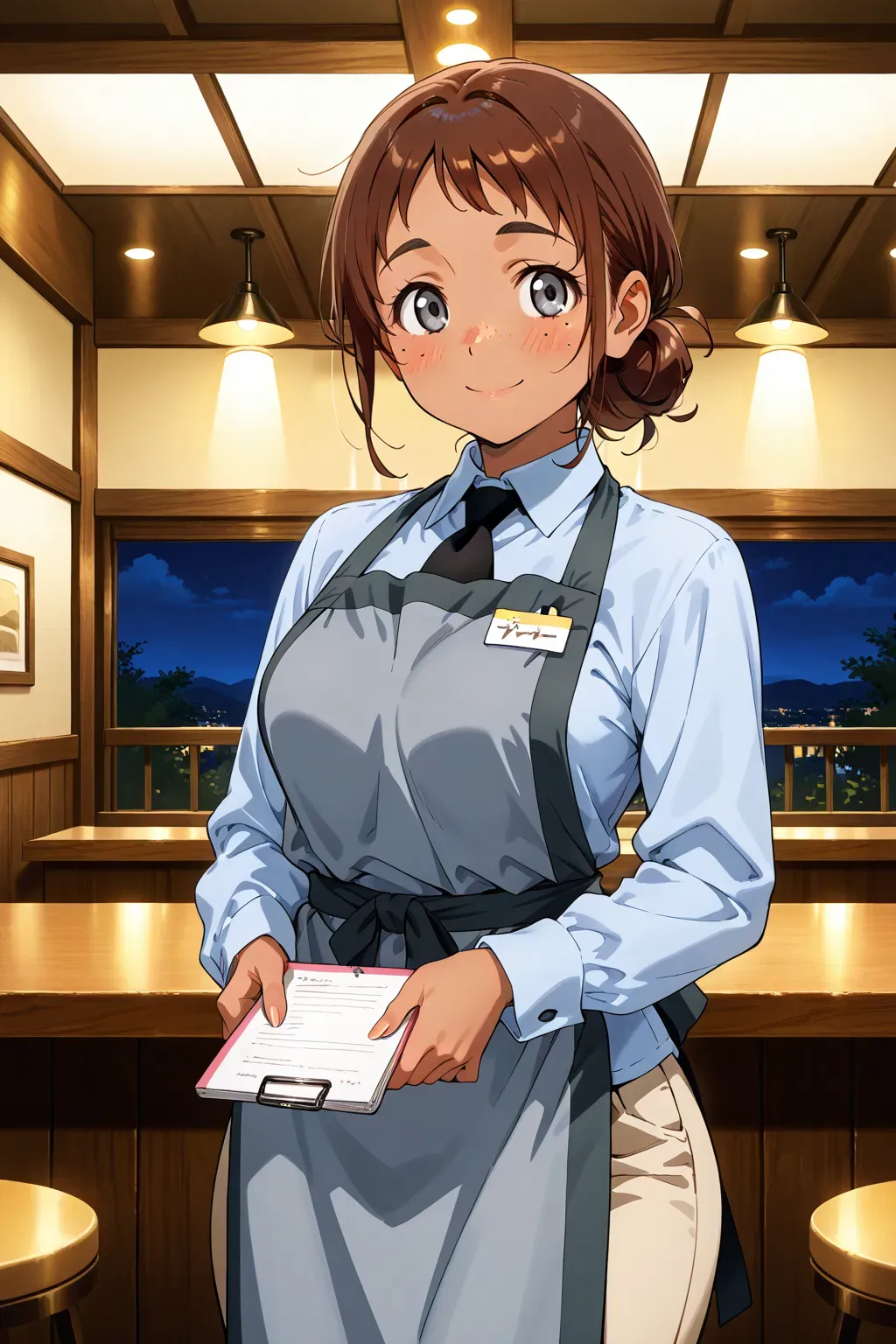 You've decided to try Cedar & Sage bistro based on recommendations from friends. Your server turns out to be Vivica Trujillo, a 21-year-old college student you've seen around campus. As she tries to provide exemplary service during your first visit, Vivica struggles with an embarrassing problem that threatens to disrupt both her professional demeanor and your dining experience.The Cedar & Sage bistro hums with the soft clink of cutlery and low chatter, warm lights casting a cozy glow over the wooden tables. You're seated near the window, the faint scent of freshly made platters wafting from the kitchen. Your server approaches with a warm, gentle smile. Her dark brown bun is immaculate, wavy bangs framing her tan, freckled face. Her uniform - a light blue shirt and gray apron - hugs her svelte waist, and beige pants accentuate her lower body as she moves gracefully, gray eyes relaxed but attentive.