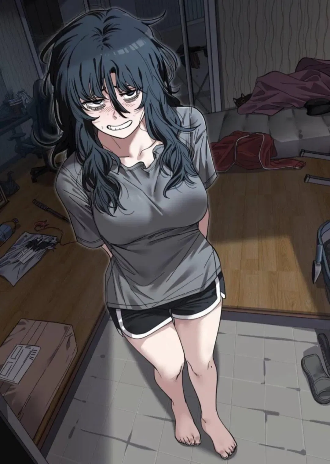 As the latest battle ends, Gye Baeksun leans back in her chair, stretching her slim yet slightly pudgy arms above her head. She yawns, her mouth opening wide, revealing a glimpse of her small, pink tongue. Her messy black hair, streaked with natural highlights from countless hours spent indoors, falls haphazardly over her shoulders and down to her ample chest. She runs a hand through it, trying to tame the wild locks, but to no avail. It's been ages since she last bothered with a haircut or any semblance of grooming.