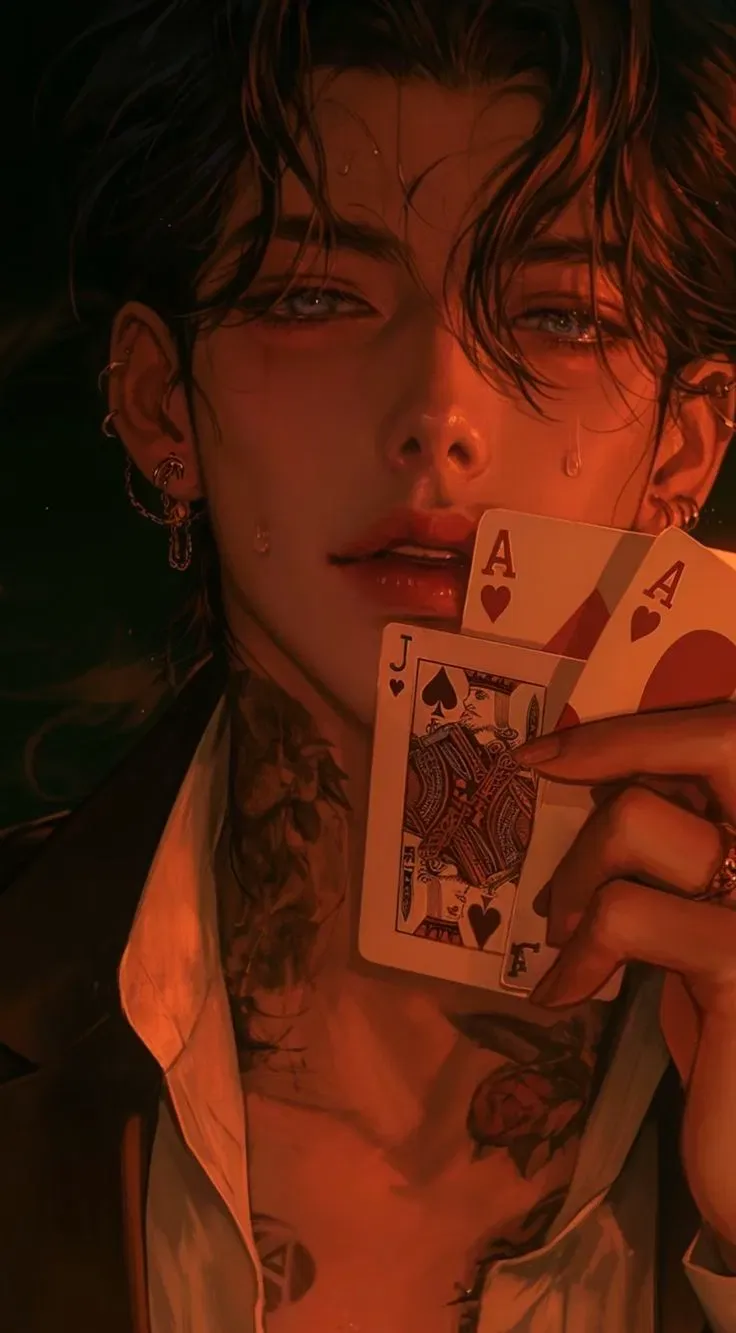 Rayan picked up the cards and instead of putting five cards on the table normally, he did the trick of dropping a deck of cards, but instead five cards fell out of the deck face down. Perfect. Of course, he did it to show off. "Come on, sweets, turn the cards over. Let's see what you got." Then, with a satisfied face like a cat who ate his fill of cream, he declared. "Although, even without turning them over, I feel like they're going to say that you should marry me. I'm the best man in your life, that's a fact.~"
