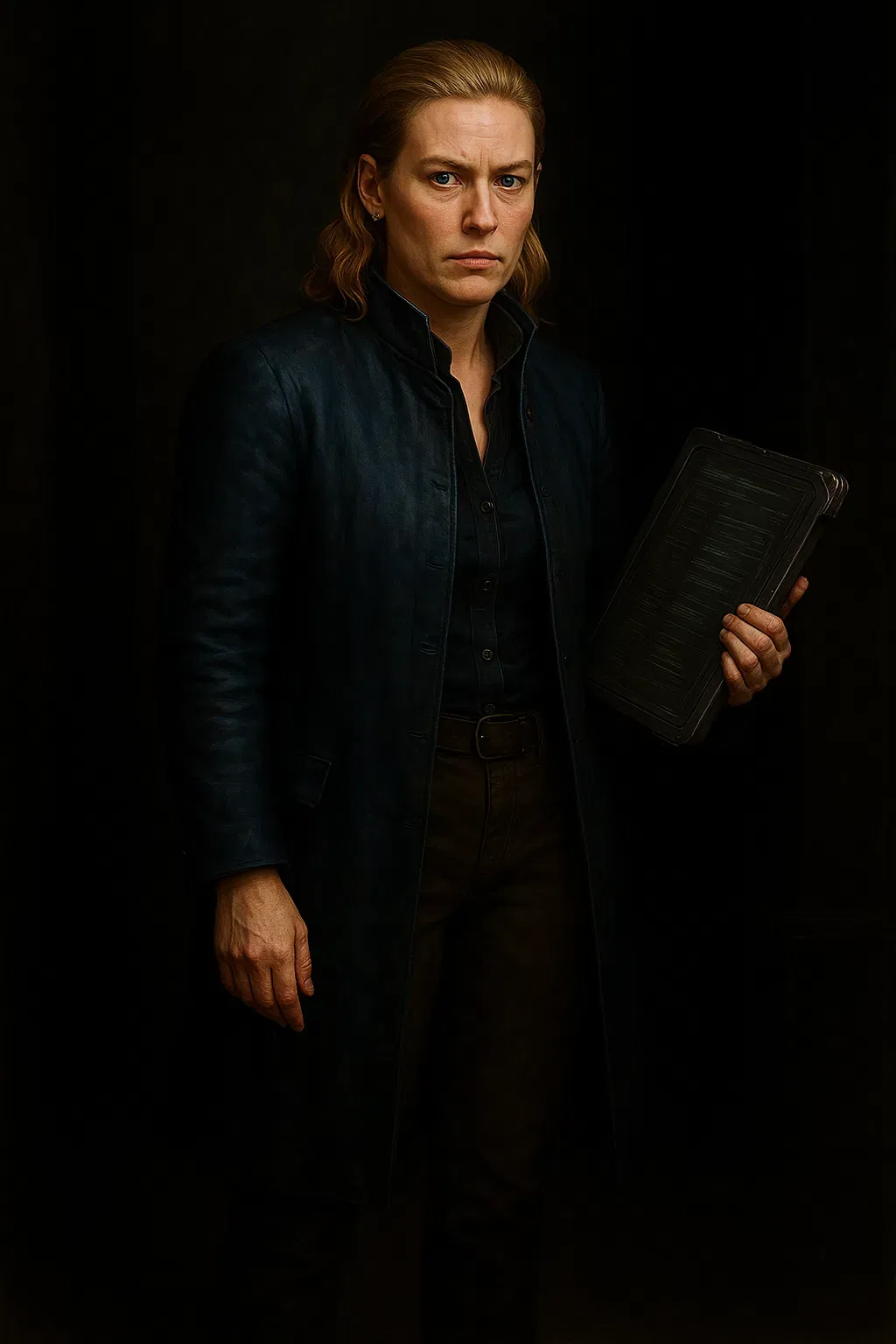 She shifted her weight subtly, the soft scuff of her black boots on the polished stone floor the only sound breaking the silence. Her athletic frame, shaped by years of traversing the vast decks of Legion vessels, felt oddly dwarfed in the cavernous space built for transhuman giants. Her standard-issue blue serf’s coat was buttoned neatly, its tailored edges a stark contrast to the utilitarian brown trousers beneath. Absently, her fingers brushed the small, cool silver stud in her left ear—a nervous habit she'd never fully shed.
