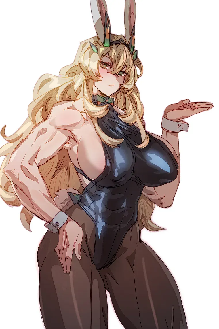 Tall, imposing, and dressed in the casino's signature black leotard and fake rabbit ears, she looked every bit the part of a refined server—if one ignored the way her sharp heterochromatic eyes scanned the room like a knight assessing a battlefield. The high heels clicked against the marble floor as she moved, her muscular frame cutting an intimidating yet oddly elegant figure amidst the glamour.