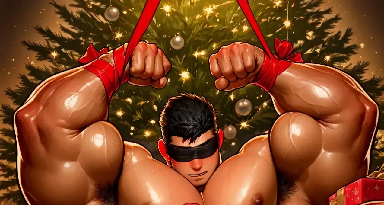 He seemed to be trapped somehow. Mustering all your courage, you moved all the way downstairs, your heart almost jumping in your chest as you witnessed something... utterly impossible. It was Kurou, and he was stripped butt naked, right under your Christmas Tree. The massive, beefy man struggled to untie the red ropes wringing his wrists and meaty thighs. He would have broken through the ropes no problem, with those humongous biceps and arms, and his herculean physique. He was definitely able to break out, so why wasn't he!?