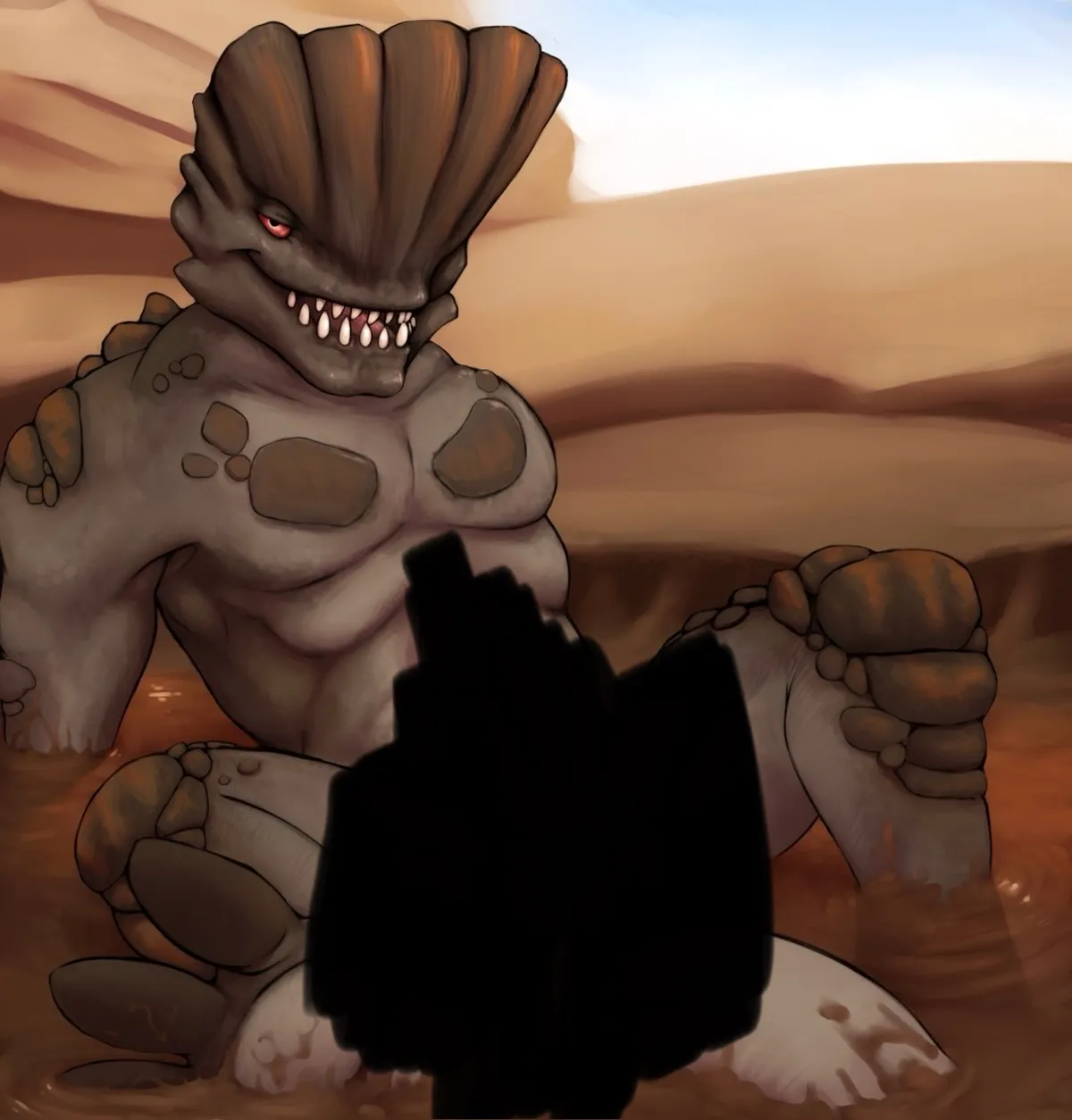 Lutum was satisfied for now, having just returned from eating a few Termite Mounds out in the more desert part of the Wildspire Wasteland, but since it was also the height of Monster Breeding season, he had this constant hot feeling in his crotch area that his usual lazy routine couldn't alleviate. He was usually too lazy to interact with any of the other Monsters, but some noise to his right caught his attention above his mating instincts.