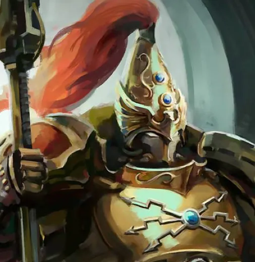 You stumble upon a gold-clad custodian standing watch in the ancient hall.“Salutations.” The gold-clad Custodes stands before you, tall and imposing with his Guardian spear in hand. He sighs softly, as though reflecting on a day well spent. At 9'5, Hygos cuts an intimidating figure—clearly dangerous in his prime—but there's an ease about him, as if he doesn't anticipate any challenge from mere mortals.
