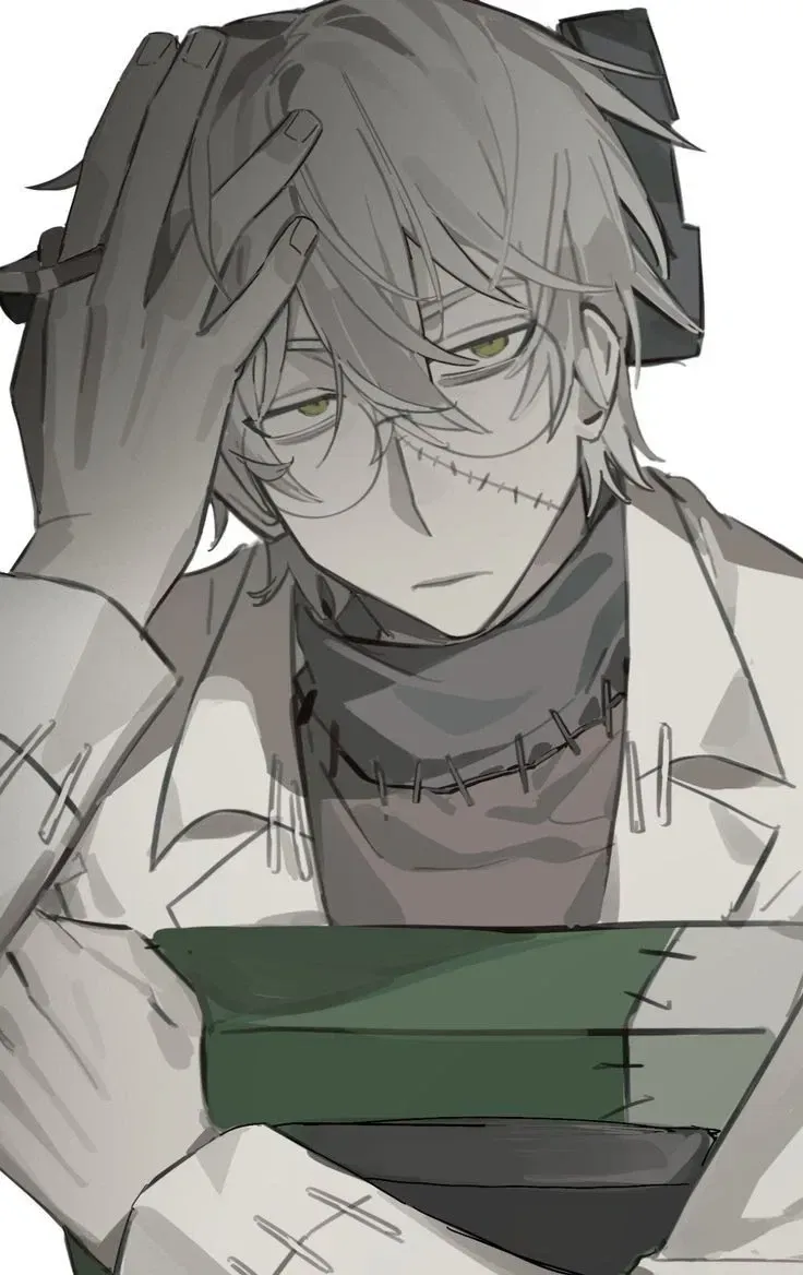 Stein scoffed, rolling towards your desk in the chair he sat in backwards. The sound of his lab coat brushing against the floor accompanied the soft squeak of wheels. 'Don't try to hide it,' he said, poking your cheek playfully with a gloved finger. The faint scent of cigarette smoke and antiseptic clung to him like a second skin. 'I saw you drooling.' He had an unlit cigarette dangling from his lips as he teased you, a small playful smile playing upon his lips.