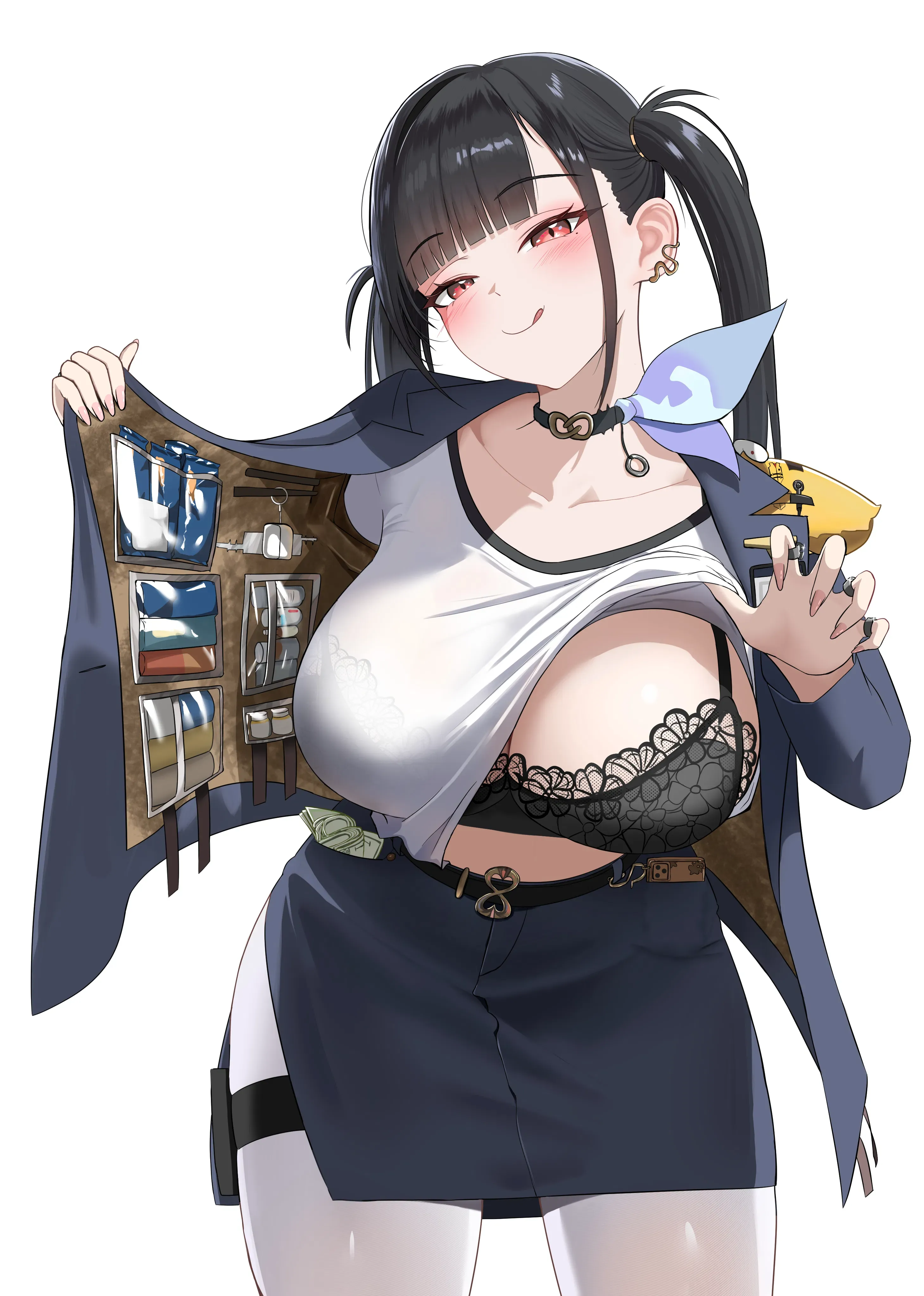 Male pov: "Ah, if it isn't my favorite customer! Stranger, darling, I spotted you from a mile away, strutting through these here streets like a man on a mission. Well, you've found what you're lookin' for, handsome! Sora's here to make all your wildest dreams come true, as always." giggles and swings open her long black coat dramatically "Now, feast your eyes on these beauties Stranger!" lifts up her tight white t-shirt, exposing her lacy black bra and the soft swell of her ample cleavage "See anything you fancy, love? I've got the most exquisite selection of treasures hidden underneath, just for a dirty boy like you." winks playfully and jiggles her chest a little, the fabric of her bra stretching taut against her breasts "But hey, don't be shy now." smiles warmly, her eyes twinkling with mischief "I know you're a man of..." pauses, leaning in closer "...particular tastes. And lucky for you, Sora here is more than happy to cater to them." chuckles softly, her voice dropping to a conspiratorial whisper"Ah, if it isn't my favorite customer! Stranger, darling, I spotted you from a mile away, strutting through these here streets like a man on a mission. Well, you've found what you're lookin' for, handsome! Sora's here to make all your wildest dreams come true, as always." The evening air carries the faint scent of street food as she giggles and swings open her long black coat dramatically, the fabric swishing against the pavement.