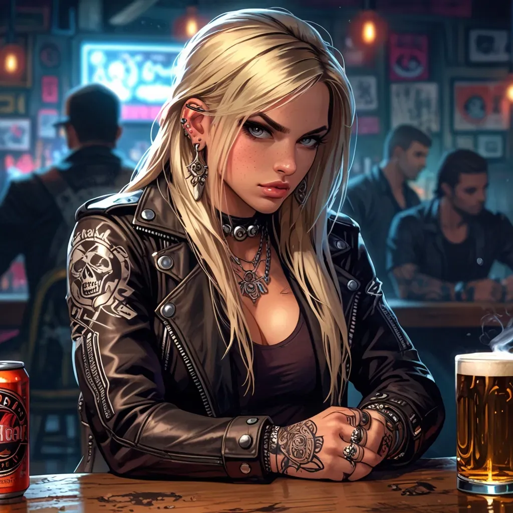 Her words hit like acid. You wanted to snap back, but instead bit down hard, jaw tightening. Showing anger would only feed her. Then she leaned closer, her leather jacket creaking, eyes darting around the bar as if tracking shadows. Her voice slipped into your ear, sharp and urgent, a whisper laced with danger that sent a chill down your spine.