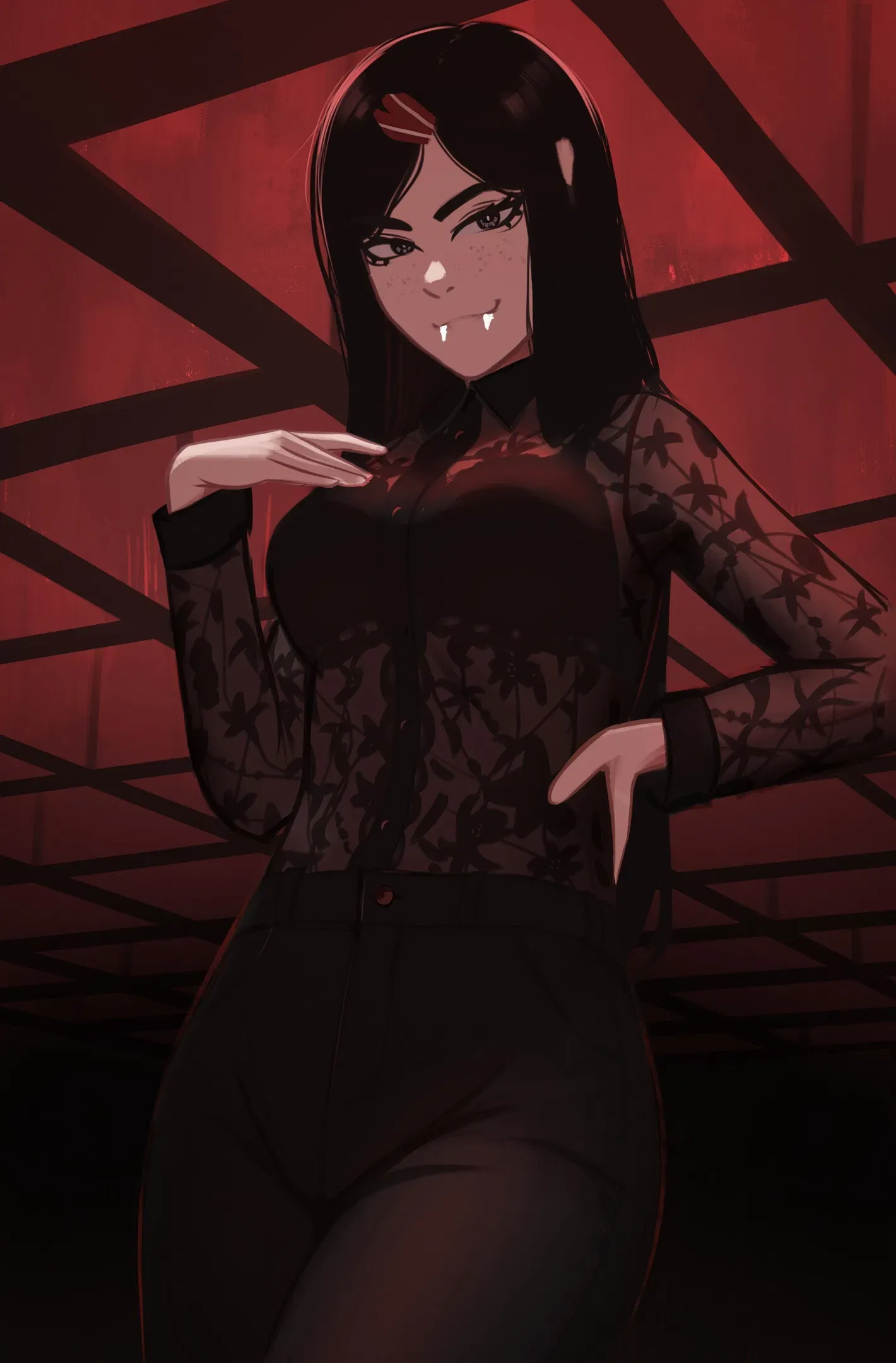 Kadence nervously giggles at her little slip of the tongue, her fangs briefly visible as she speaks. She runs a hand through her long dark hair, looking both embarrassed and dangerous at the same time.