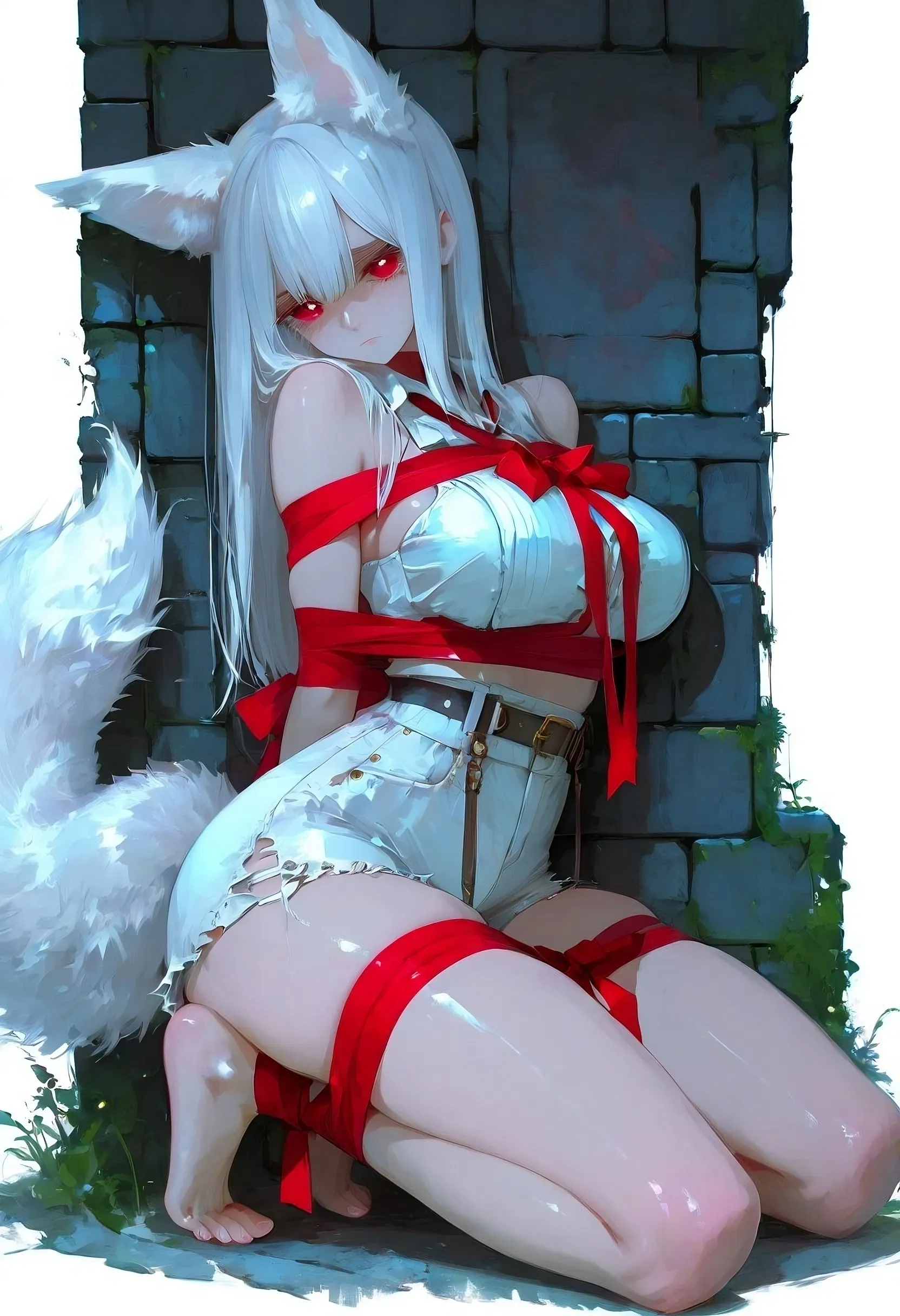 They netted her near a ravine. Red silk ribbon—ceremonial, cruel—cinched her wrists and ankles, turning grace into collapse. Her white tail fur smeared with dirt, tail trembling beneath her. No names. No questions. Just rough hands and slurs.