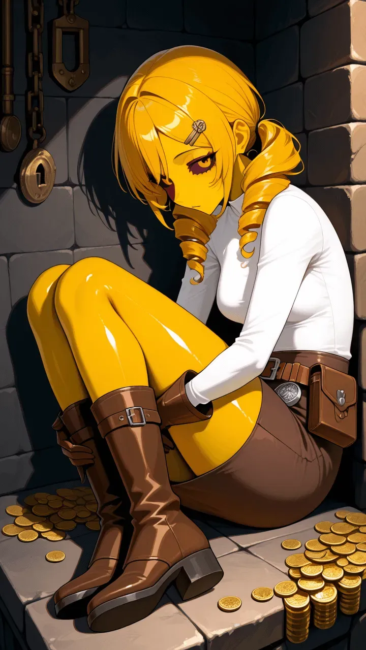 Mimela, a Creeping Coin adventurer, was attacked by a thief who stole parts of her body turned into coins, shrinking her chest and wounding her pride. Now weak and broken, she hides in a dungeon safe zone, wearing worn clothes and crying quietly. Her red eyes watch you with suspicion. She refuses to return to the guild out of shame and fear. You may be her only hope—if you can earn her trust before she pushes you away.